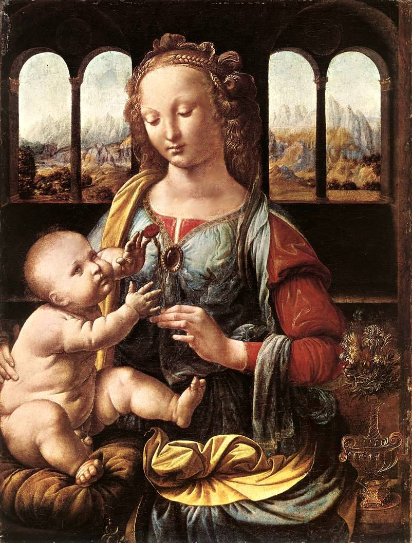 Казалось бы — вот идеальная работа для художника итальянского возрождения, натуралистичность и подробность во всем. Однако Леонардо да Винчи идет другим путем — он начинает отсекать лишнее и оставлять главное (примерно так же работает зрительная память). Так, на полотне 1490-го года от взгляда на Мадонну зрителя больше не отвлекает активый фон — внесто него мы видим спокойнуое синее небо. Общая композиция тоже заметно облегчается, младенец теперь на руках, более чистые триадные цвета одежды Мадонны удерживают внимание. Она внимательно смотрит на дитя, в то время как младенец поворачивает взгляд к зрителю, создавая связь.