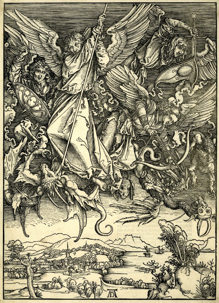 Лист 11: Архангел Михаил повергает дракона. Из цикла «Апокалипсис». 1498.