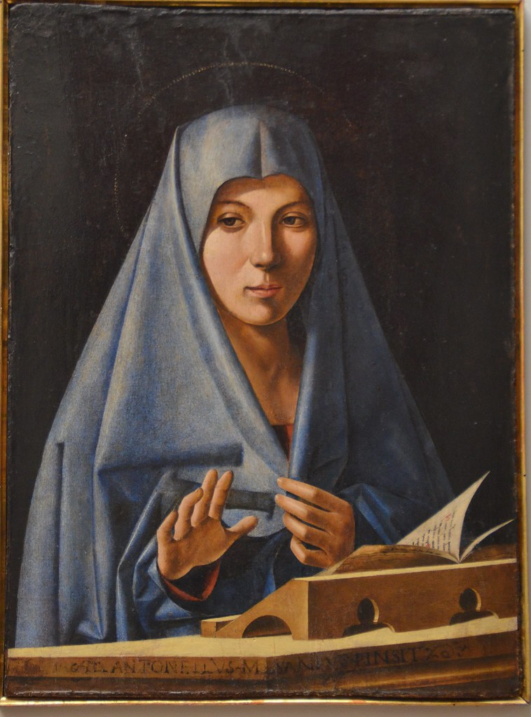 Трогательная Мадонна Антонелло изображена на тёмном и изолированном фоне, который передаёт ощущение священности. Художник изобразил её одновременно реалистичной и загадочной. Она кажется осязаемой: её рука протянута над раскрытым молитвенником к зрителю в благословении, а её скромная поза и опущенные глаза передают сдержанность.