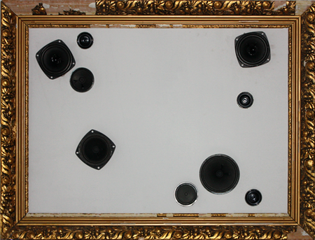 В работе «soundframe» художник помещает динамики в границы рамки, тем самым концептуально визвуализируя звук в динамике, связывая окончательно их в единый художественный образ.