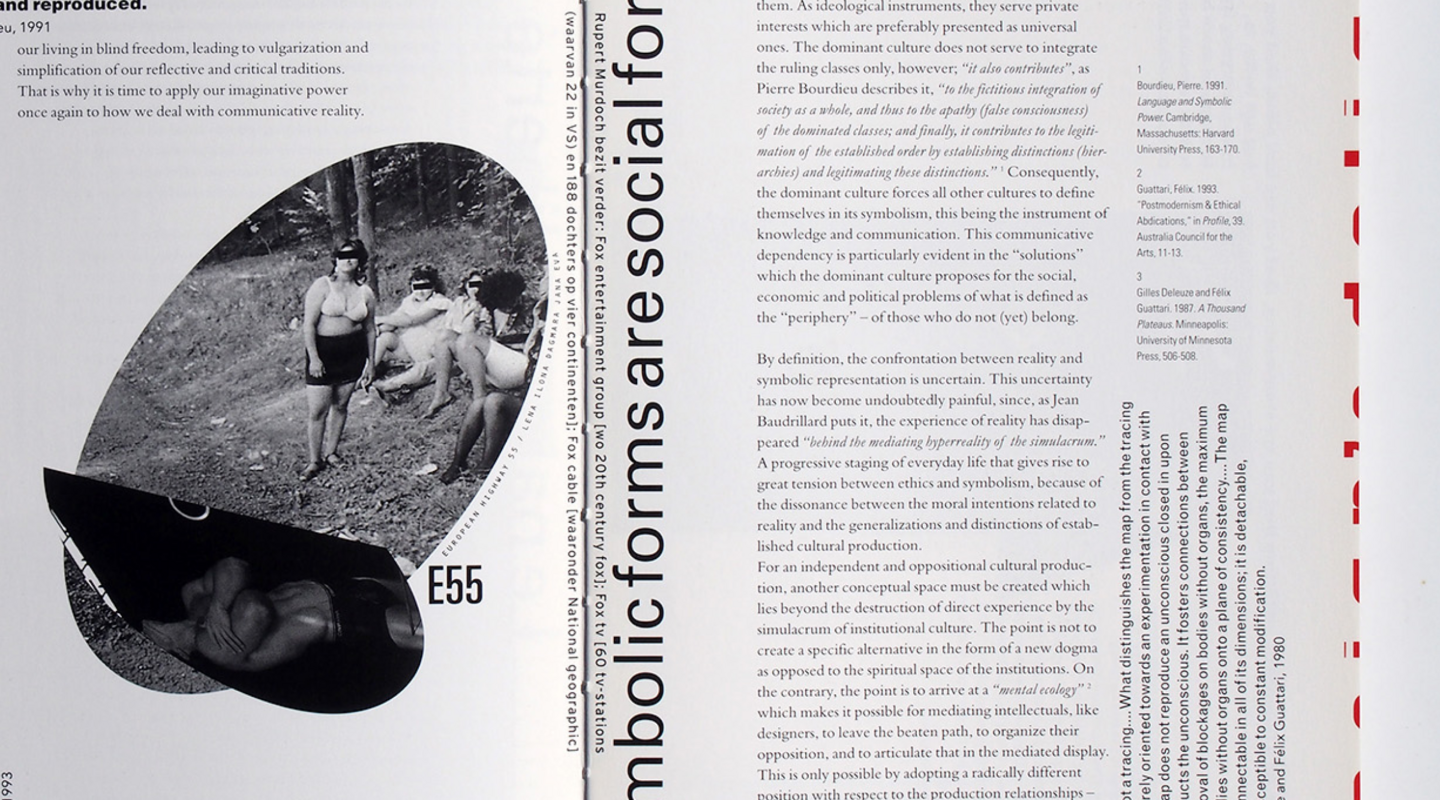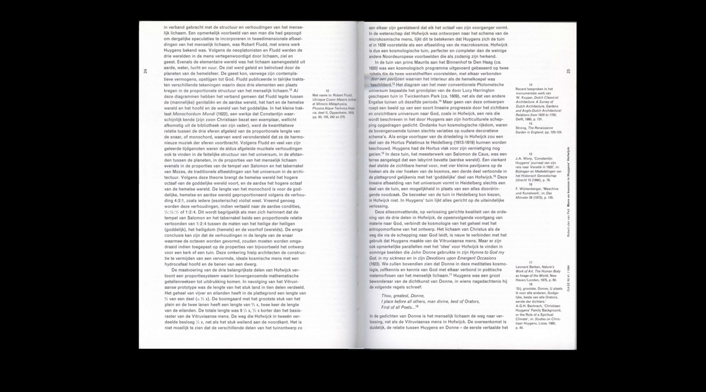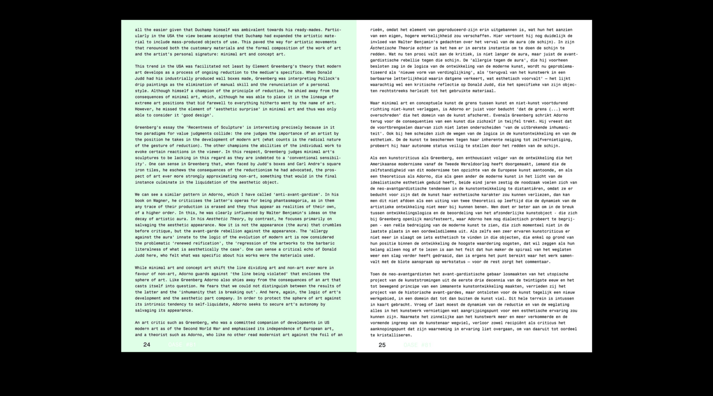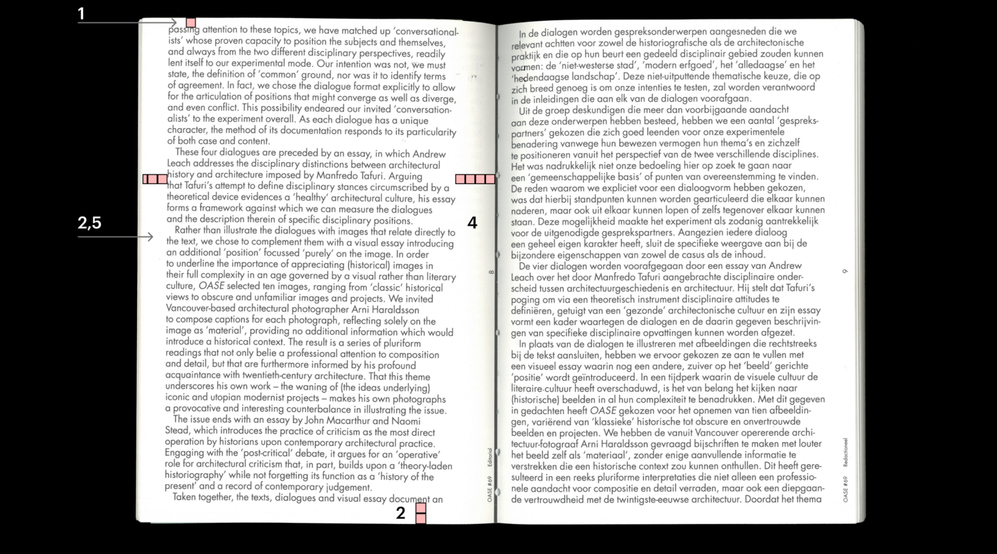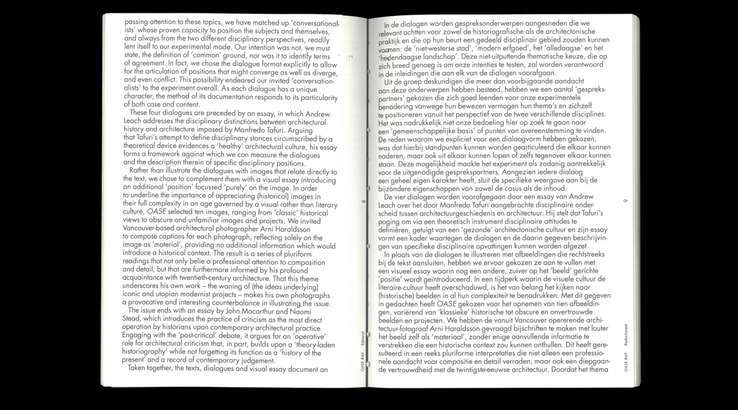 Макет этого номера журнала «OASE» (дизайнер — Карел Мартенс) цитирует механистичный, утилитарный стиль. Отсюда — полное отсутствие декоративности, скудный набор выразительных средств, моноширинный шрифт и минимальное количество его размеров и начертаний.