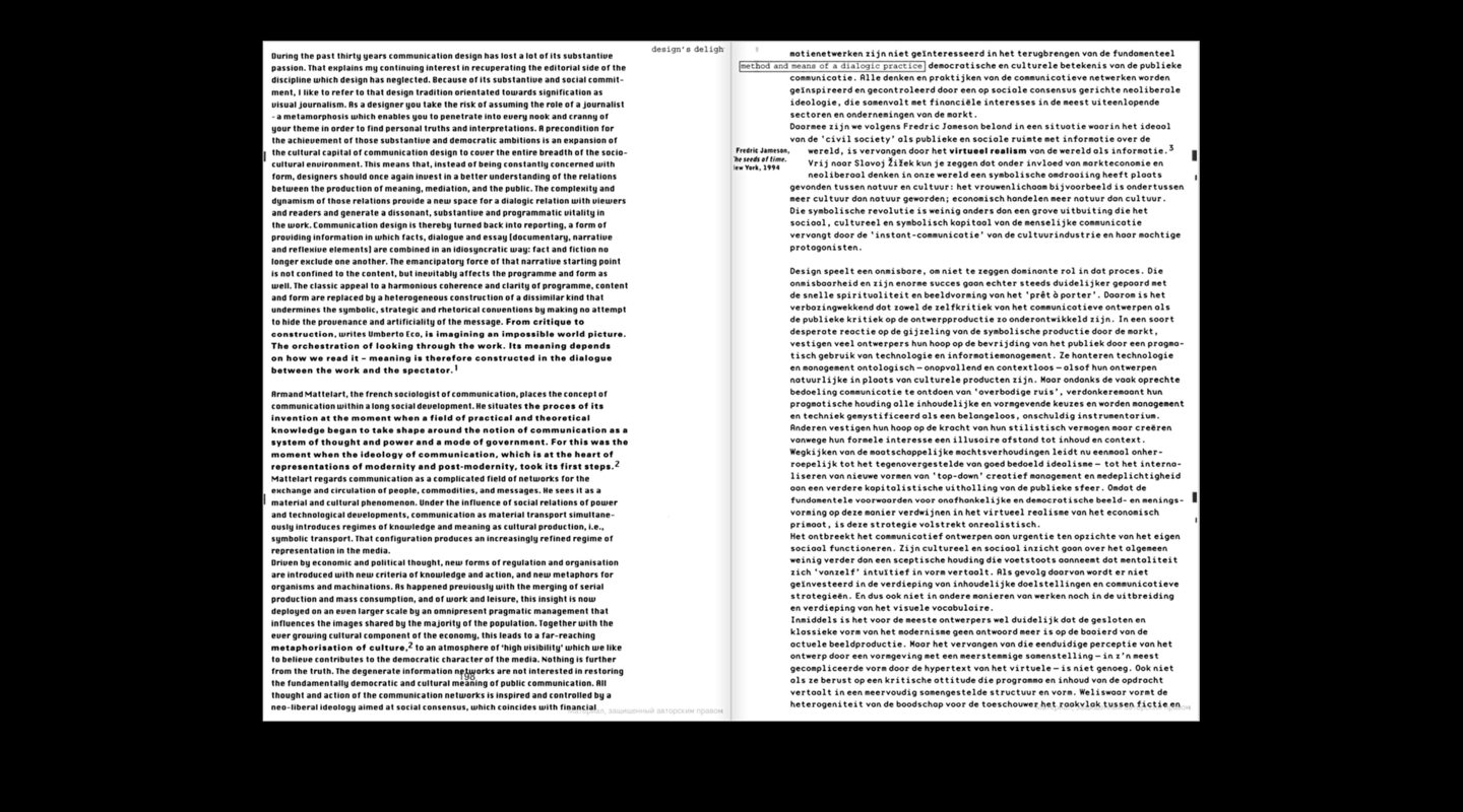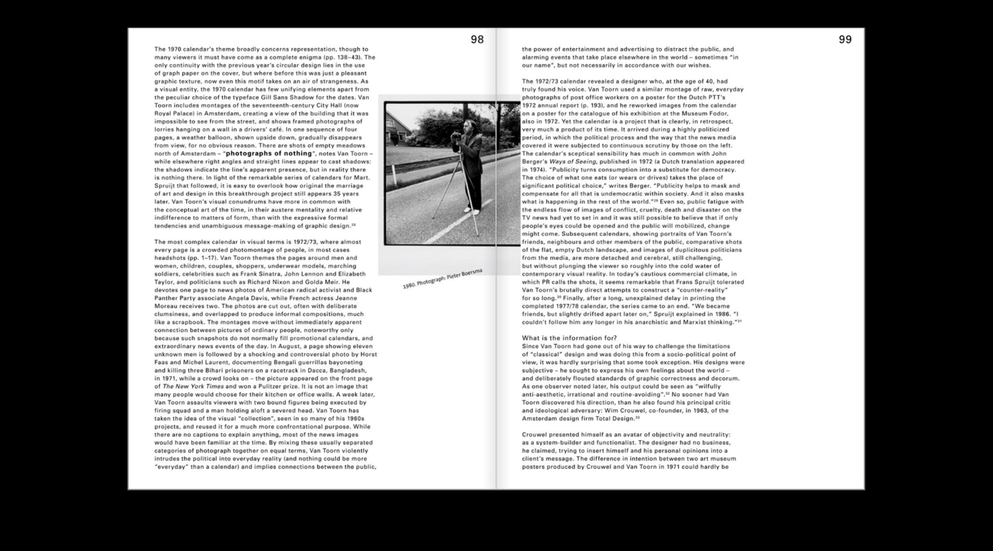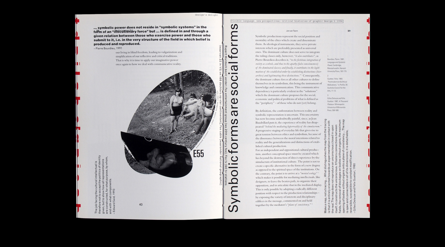«Design’s Delight» Яна ван Тоорна — абсолютный пример постмодернистской книги. Здесь сочетается несочетаемое — шрифты всех возможных эпох в нескольких вариантах начертаний. Композиция предельно подвижна, в способе завёрстки изображений появляются нестандартные для книжного макета формы, набор изменчив, текст поворачивается то по часовой стрелке, то против неё, подрисуночная подпись и вовсе теряет привычный вид прямоугольника, повторяя собой форму изображения.