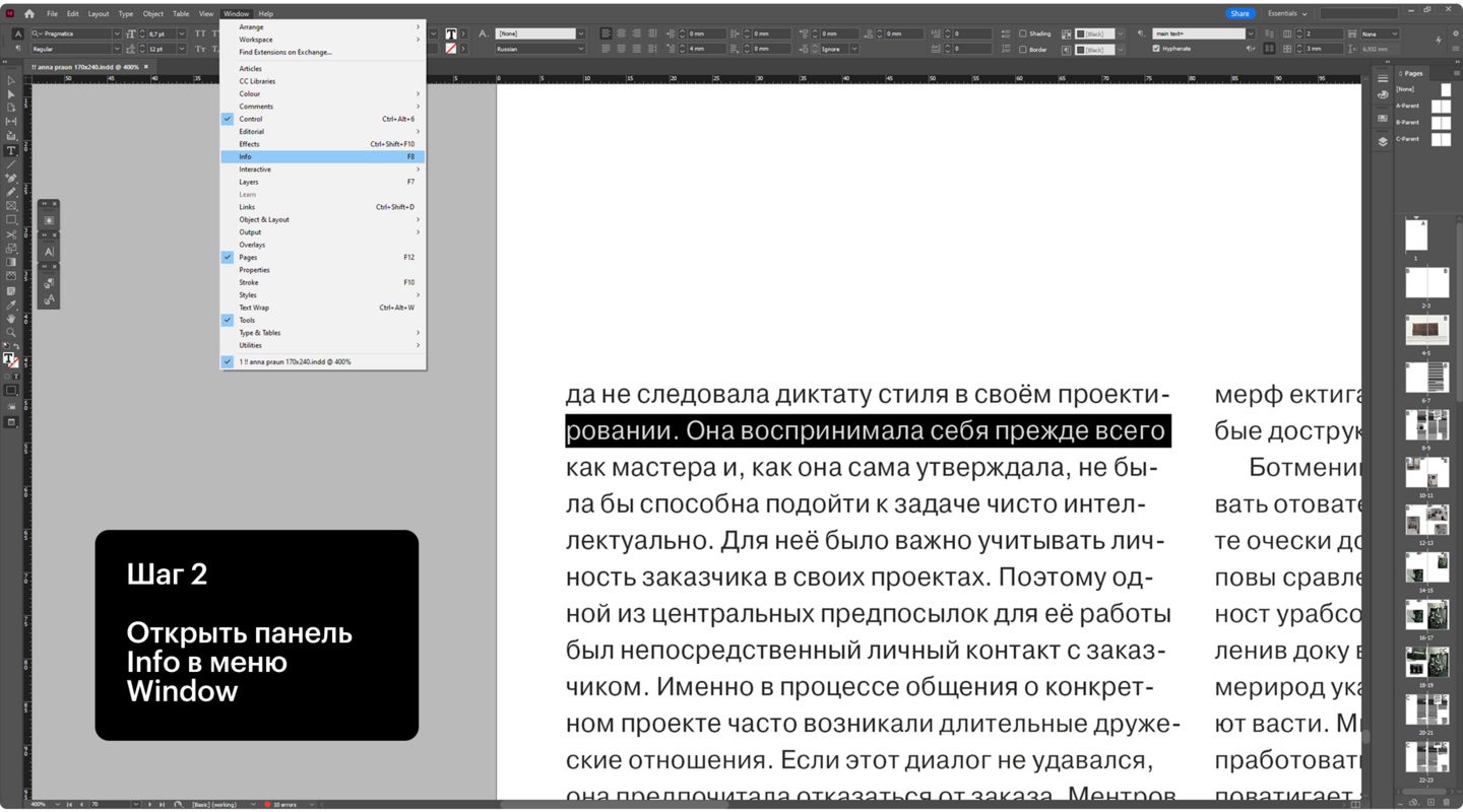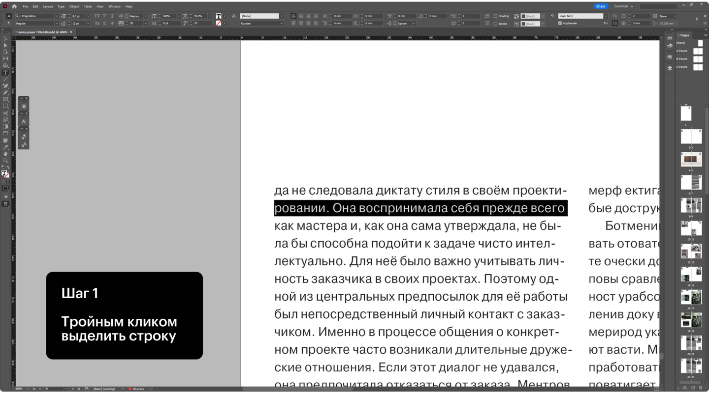 1. Стабильная длина строк. 2. Аккуратное выравнивание (по левому краю или по ширине — но с дополнительной настройкой Justification в Paragraph Style). 3. Включённые и достаточно частые переносы слов, чтобы избегать широких пробелов (настройка Hyphenation в Paragraph Style). 4. Отсутствие «дыр».