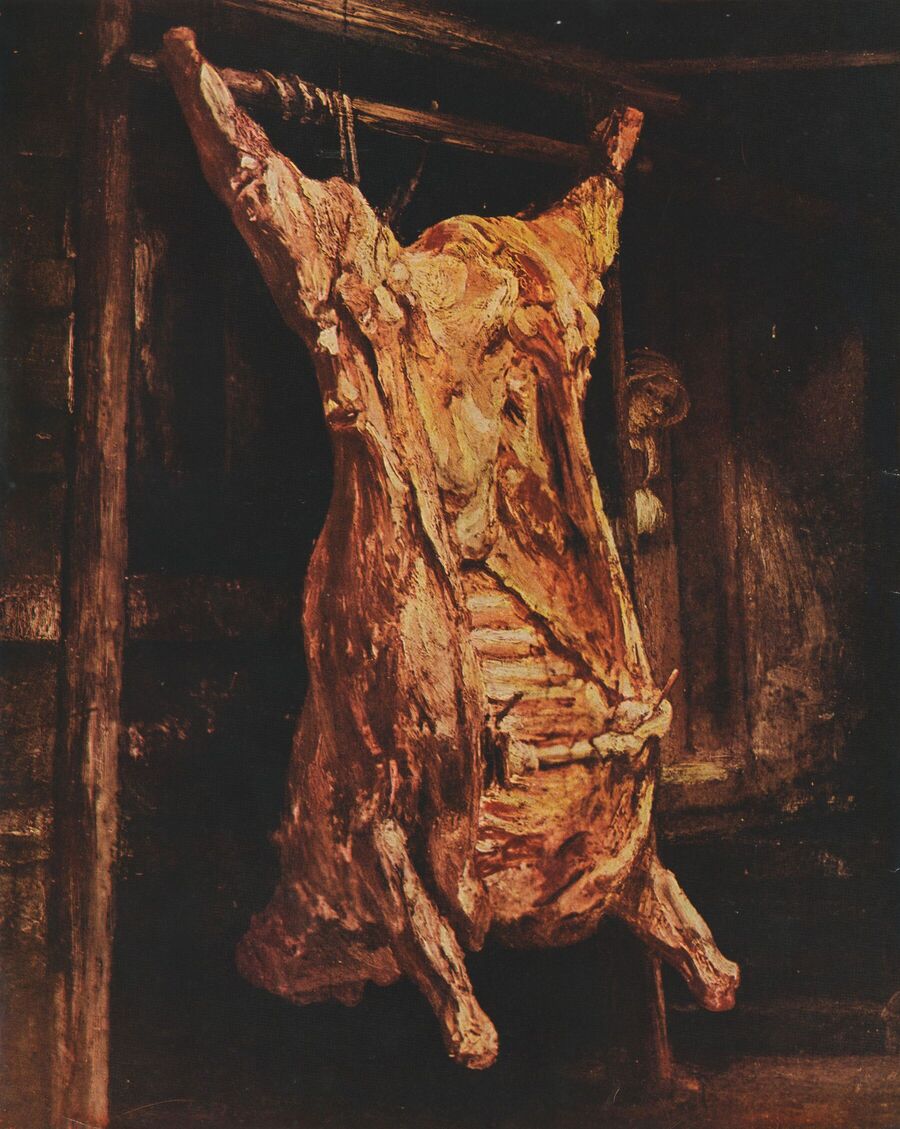 Слева: Фрэнсис Бэкон, фотография Джона Дикина, 1952 Справа: «Туша быка», 1655, Рембрандт Харменс ван Рейн