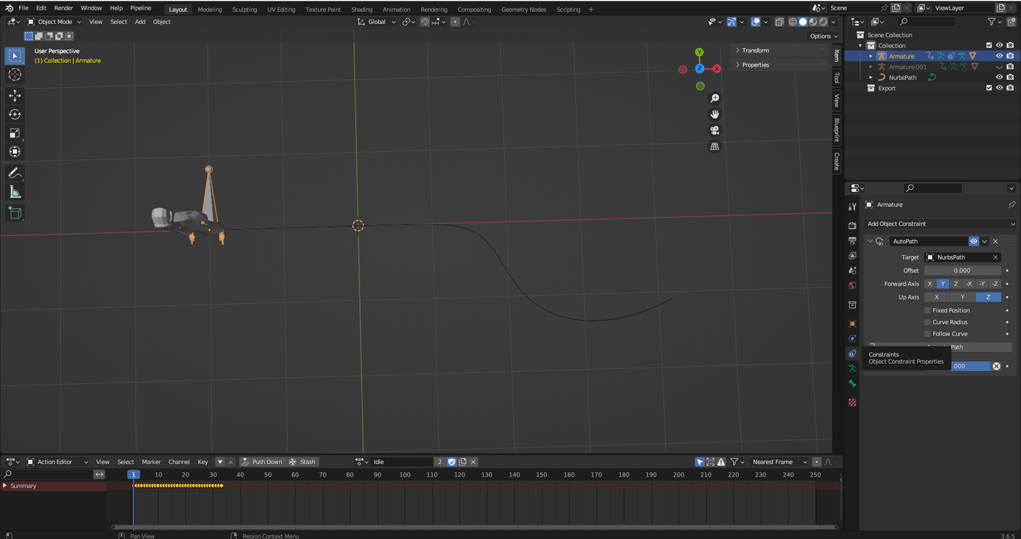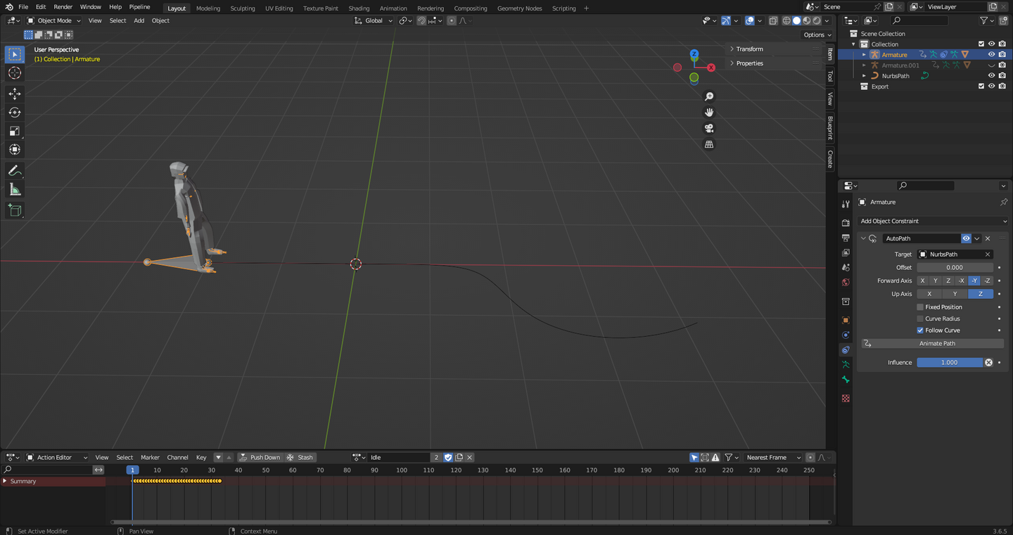 Чтобы повернуть персонажа в нужную сторону, выбрав скелет персонажа, перейдите во вкладку Constraints в правой части экрана. Затем выберите нужную ориентацию для вашего персонажа, поставьте галочку рядом с Follow Curve и нажмите Animate Path.