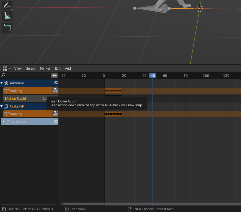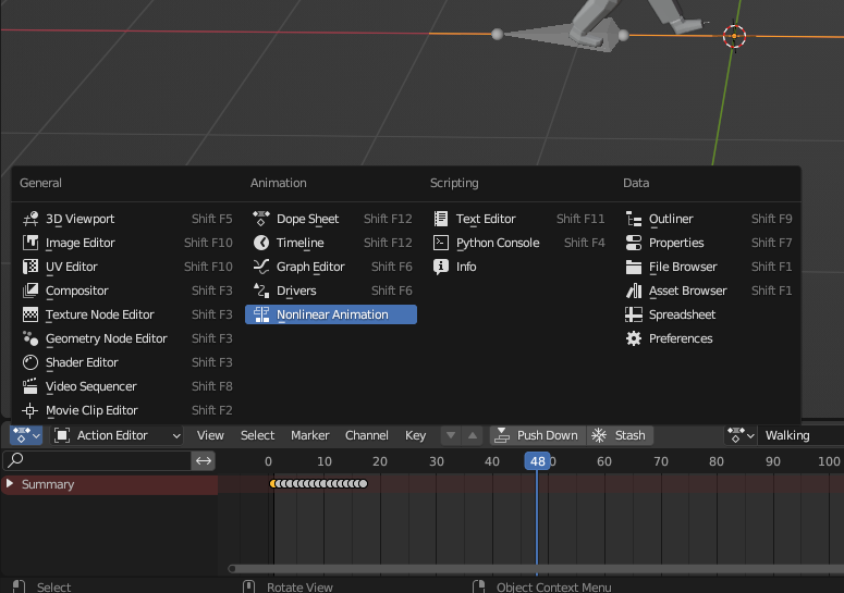 Теперь во вкладке в Action editor просто выберите новую анимацию и переименуйте ее нужным образом. Удалите только что импортированные меш и скелет.
