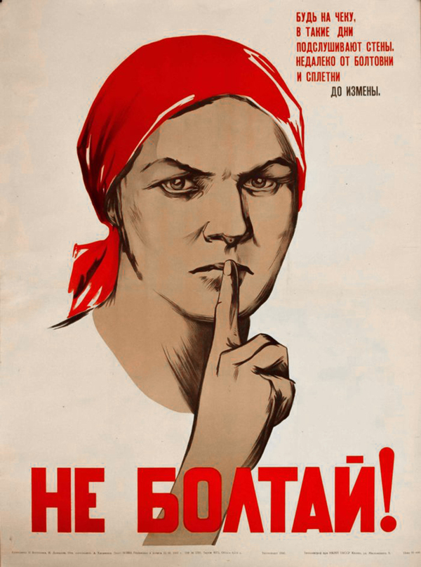 Так, Картина «Не болтай!» представляет собой прямую цитату из советского агитационного плаката Нины Ватолиной и Николая Денисова, напоминавшего гражданам о важности секретности во время войны. Но в интерпретации Комара и Меламида этот образ иронично переосмысляет призыв к молчанию, намекая на абсурдность и вездесущность государственной цензуры, ставящей каждый жест и слово под подозрение. Зрителю предлагается увидеть не агитатора, а неравнодушного человека, который предусмотрительно предостерегает зрителя, об опасности свободомыслия в советском государстве.