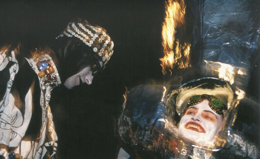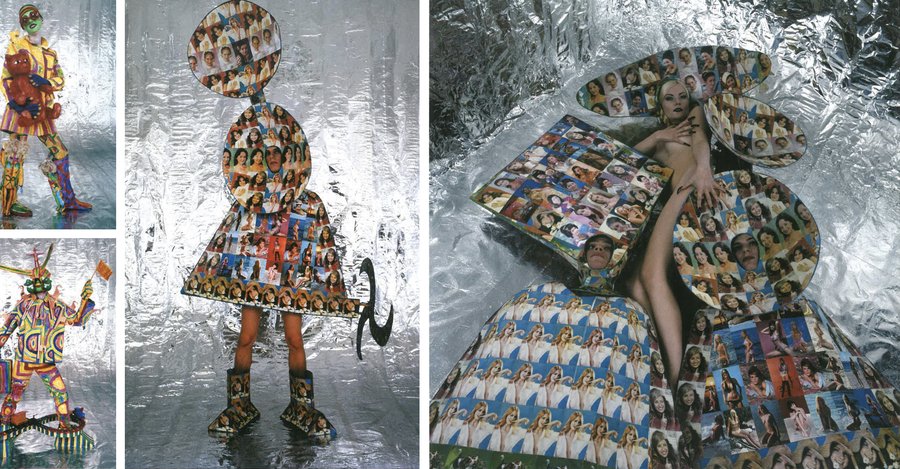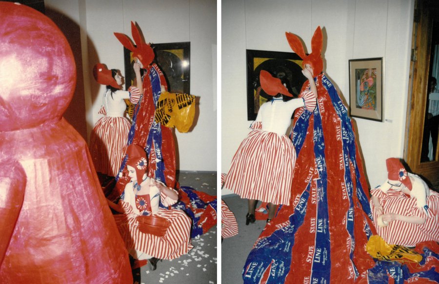 Костюмы Андрея Бартенева к перформансу «Спящая красавица», 1996 год / На фотографии справа Рената Литвинов, фото: Тимур Гриб / Костюмы Андрея Бартенева к перфрмансу «Фруктовый покер», 1994 год