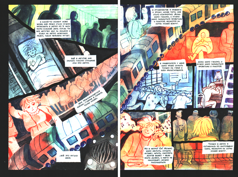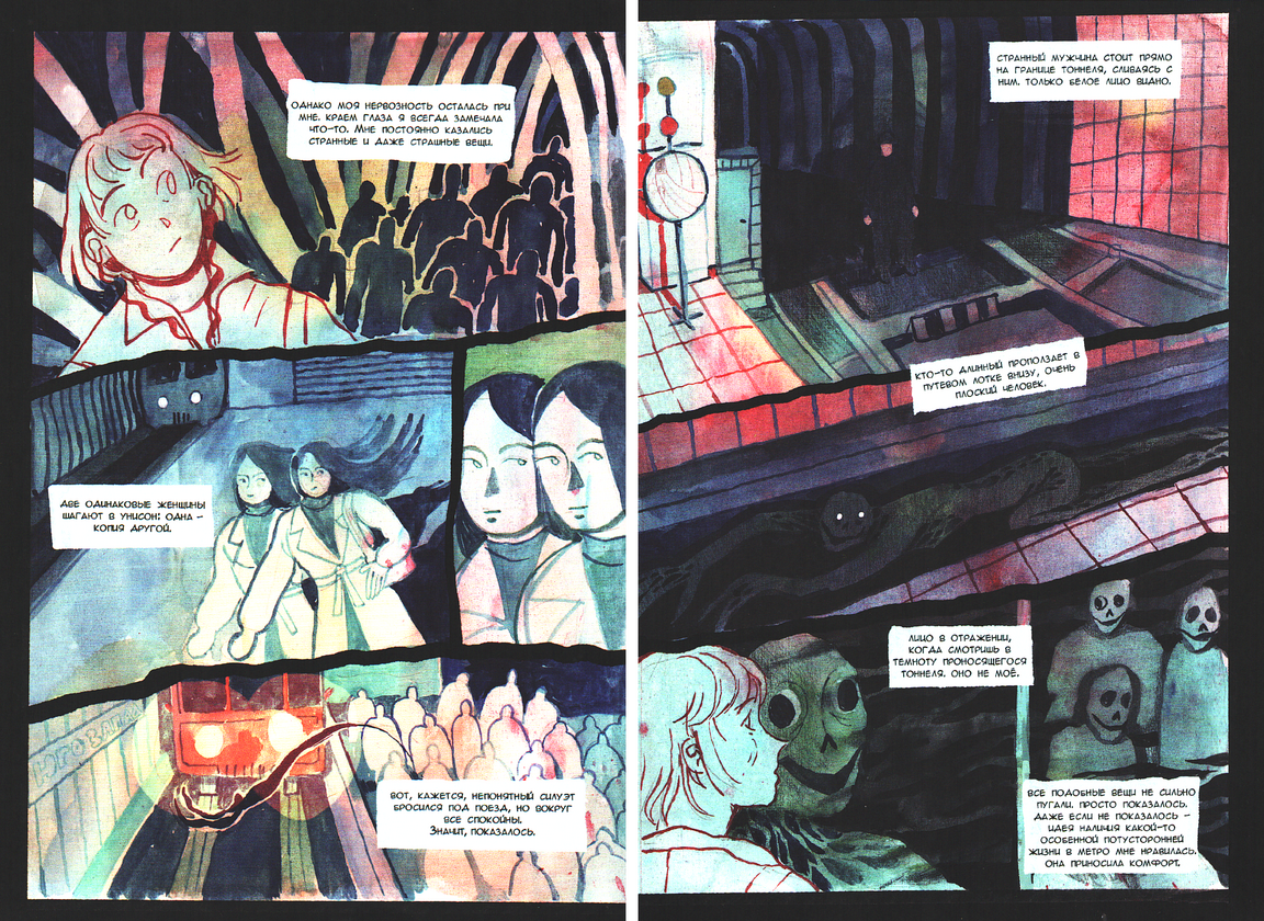 Метро может изображаться как уютное и, вместе с тем, жуткое место. Например, героиня комикса Анны Рыжовой «Показалось» чувствует себя комфортно в подземке до тех пор, пока не начинает замечать странные вещи.