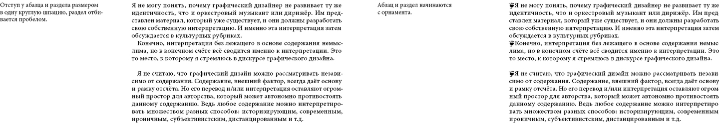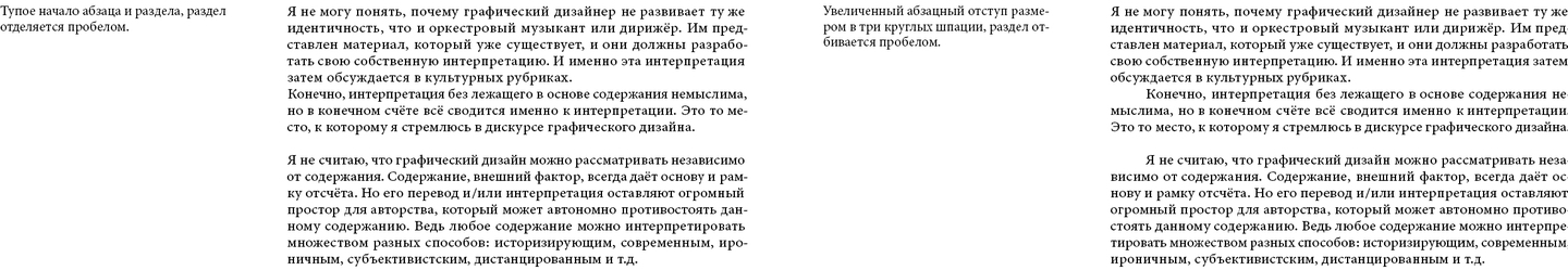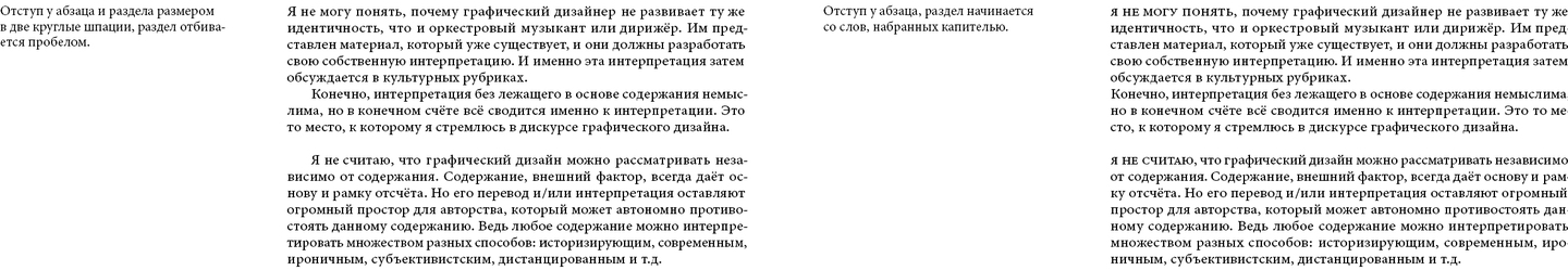 Распределение масс текста при оформлении издания является не просто технической условностью, указывающей на структурирование мыслей автора, но и достаточным знаком, который задает ритм повествования, побуждая зрителя к прочтению. Так абзацные отступы могут выступать как действительная организация размышлений автора текста, а пробельные строки — как обозначение паузы и перехода к новой мысли.