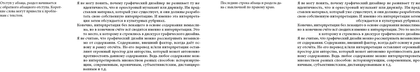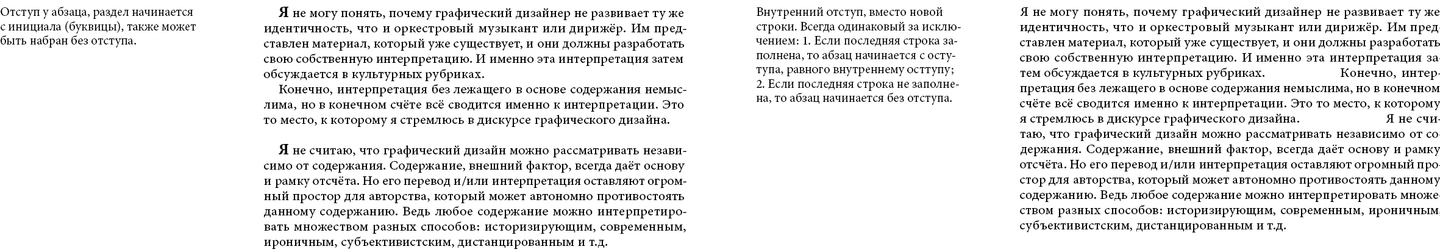 Привычные для зрителя отступы и членение на блоки создают комфортную среду для чтения. Часто эксперименты с данными элементами текстового набора могут вызывать различные ощущения: от раздражения, рассматривая что-то непривычное, до недоумения и непонимания. Некоторые приемы могут быть чересчур «перетипографированы», что точно будет неудобочитаемым, поэтому нередко такие заигрывания с дроблением текста находятся именно в книгах по типографике, где это направлено для определенной, чуткой к типографике, аудитории.