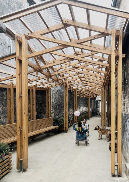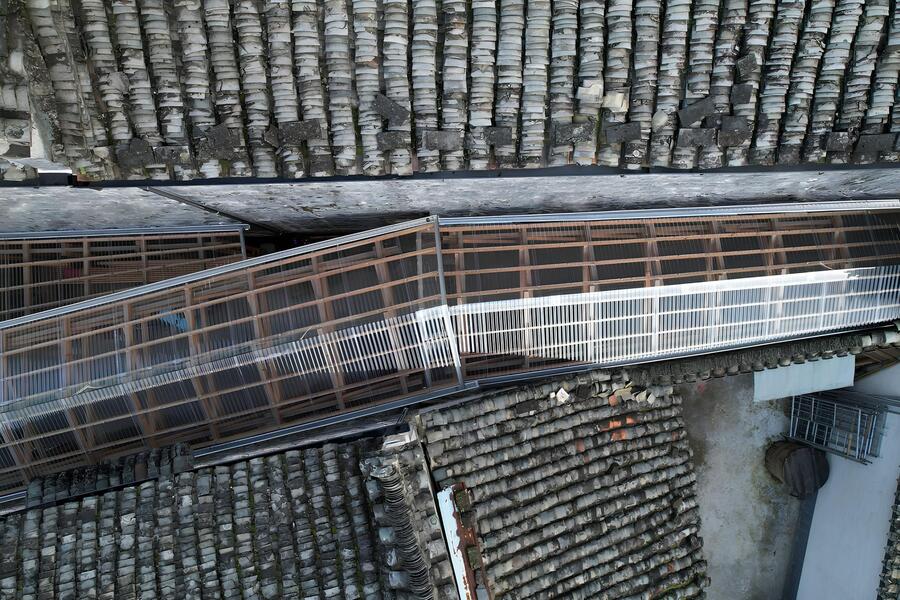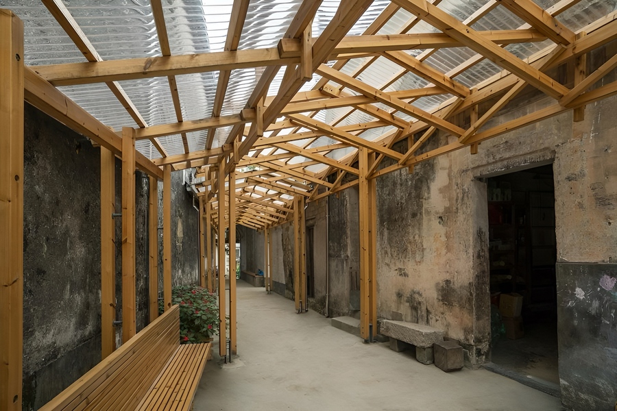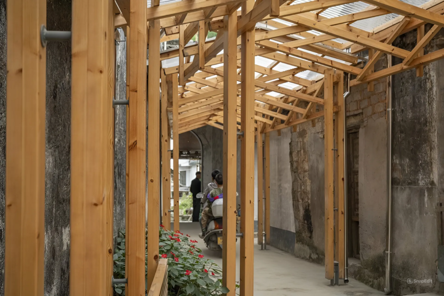 Проект «Коридор Хуэйчжоу» (Huizhou Corridor) был направлен на возрождение китайского села Фэну Цзи, которое в последние годы столкнулось с такими проблемами, как отток населения, в особенности молодежи, и обветшание исторических зданий. Переулок относится к категории «смешанное использование низкой плотности» и выделяется не только своим уникальным размещением среди зданий эпохи династии Цин, но и значимостью для местных жителей. Коридор Хуэйчжоу был центром объединения односельчан, основным пространством для общественных мероприятий и непринужденного общения. Однако в непогоду его привлекательность заметно спадала, что вызывало огорчение у местных жителей. Дизайнерское бюро IARA нашло решение, установив крышу, поддерживаемую деревянными фермами, на протяжении всего переулка. Эта современная конструкция гармонично вписалась в городской контекст, тем самым дав возможность собираться жителям в своем «третьем месте» в любую погоду.