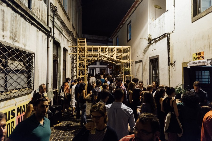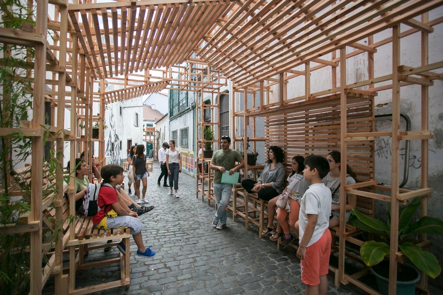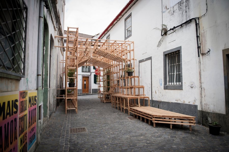 Деревянные фермы также нашли своё применение в другом интересном проекте, который был реализован в одном из переулков категорий «смешанное использование низкой плотности» и «жилье для одной семьи», расположенных вблизи исторического центра города Понта-Делгада, на живописных Азорских островах. Общественное пространство «Дом в квартале»(«Casa do Quarteirão») было создано в рамках местного фестиваля искусств «Walk& Talk» в 2016 году и черпало вдохновение из окружающей уникальной архитектуры. Авторы проекта, компания Orrizontale, стремились создать площадку, способствующую взаимодействию граждан, где местные жители могли бы наслаждаться общением и обмениваться культурными и творческими идеями. Основой пространства стала модульная система, которая включает в себя два главных павильона у входов в переулок и несколько скамеек для удобного отдыха. Хотя «Дом в квартале» просуществовал всего несколько лет и был демонтирован в 2020 году, он успел стать уютным убежищем для горожан — «третьим местом», в котором они могли собираться и чувствовать себя комфортно.