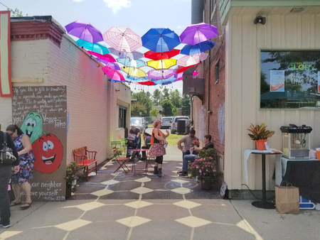 Однако далеко не всегда создание «третьего места» требует разработки полноценного проекта. Порой образованию новой точки притяжения в районе способствуют сами его жители, облагораживая неприглядную территорию. Примером такого случая может служить аллея в Окономовоке (категории «смешанное использование низкой плотности»), городе в округе Вокеша, штат Висконсин. Некогда мрачная аллея, благодаря желанию и инициативе горожан полностью преобразилась: во время ремонта переулок не перекрывался, что дало возможность каждому жителю, от мала до велика, принять участие в благоустройстве, а именно — раскрасить напольную плитку в любой цвет. После завершения работ, проходимость и популярность аллеи в Окономовоке резко возросла. Стоит также отметить, что реализация проекта была осуществлена на средства от гранта, полученного городом от AARP Community Challenge в рамках программы «Активация аллей» в 2017 году.