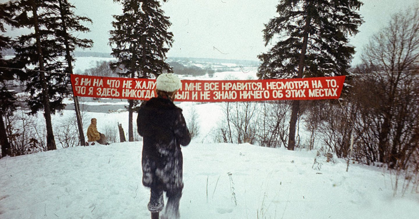 В России тогда находили другие способы решения проблемы личного опыта и публичного пространства по причине политического натиска, который привёл к большой изоляции независимых художников. Одна из ключевых особенностей того времени — использование нейтрального, описательного, аналитического языка3. Поэтому акции, одной из самых значимых арт-групп этого периода — «Коллективные действия», часто воспринимались как самобытные и нетрадиционные поэтические чтения, которые создавали некую дистанцию со зрителями.