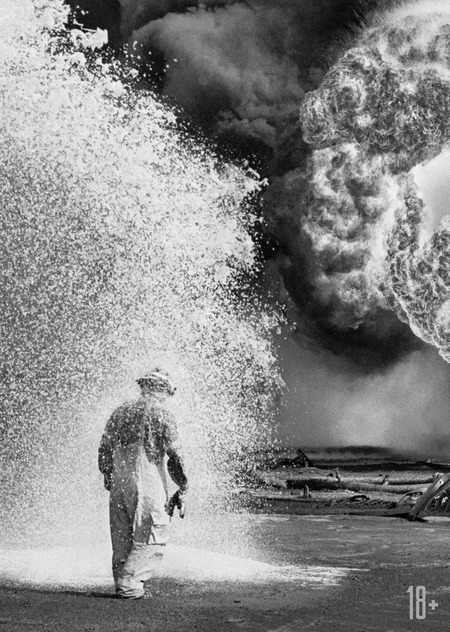 В 1991 году, когда иранские силы были вынуждены покинуть Кувейт после неудачной попытки вторжения, они подорвали множество нефтяных скважин, находящихся на территории страны. Их действия привели к огромной экологической катастрофе, которую удалось запечатлеть фотографу Себастьяну Сальгадо. Он создал серию эпических кадров, рассказывающих о последствиях подрывов. Его драматическая стилистика подчёркивает ужас случившегося. На фотографиях автор запечатлел героические усилия пожарных, пытавшихся на протяжении 258 дней остановить пожары, возобновляющиеся один за другим. Он показал нам мощь и ужас огня, абсолютно невероятные пейзажи опустошенной местности, кажется, будто созданные в иных мирах. Фотосерия Себастьяна Сальгадо стала очередным доказательством безрассудности человеческих поступков, она привлекает внимание не только к мировым экологическим проблемам, но и тем трагедиям, что приносит война.