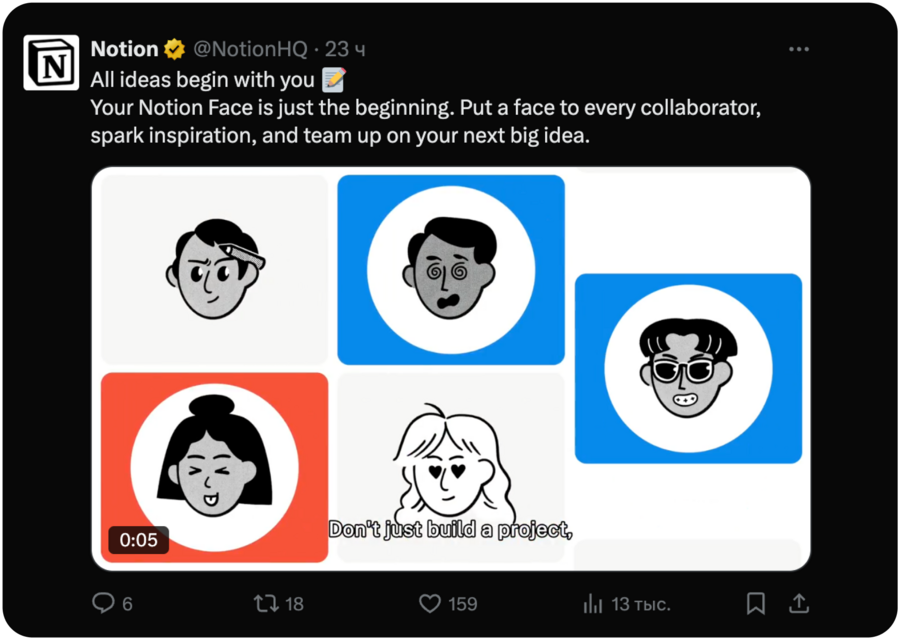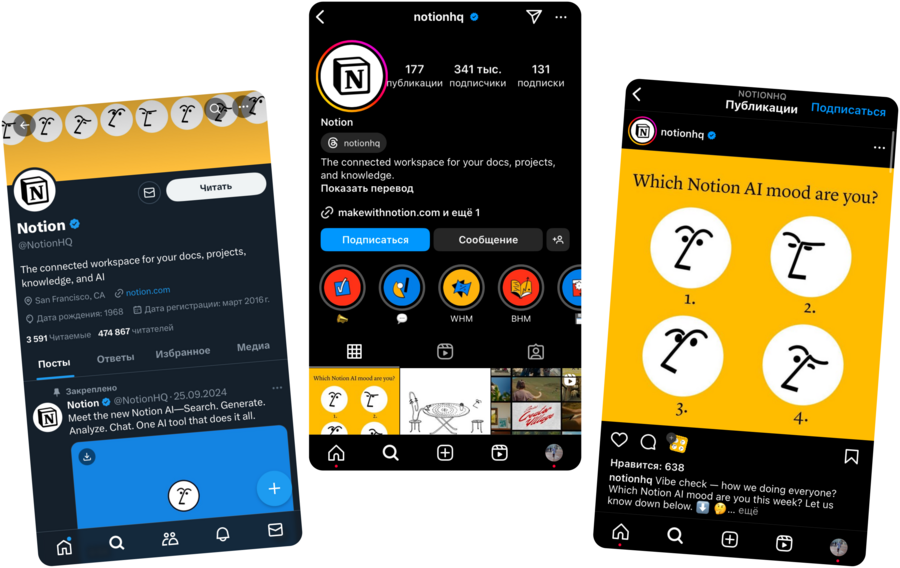 Внутри сервиса Notion предлагает строгий и лаконичный инструмент для заметок, документов и управления проектами. Однако за пределами сервиса бренд становится более дерзким и шутливым. В рассылках, на лендингах и в социальных сетях Notion активно использует своего маскота с разными выражениями лица. Компания делится успехами своих клиентов и общается с аудиторией более неформально.