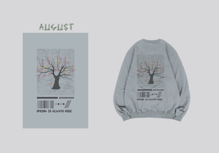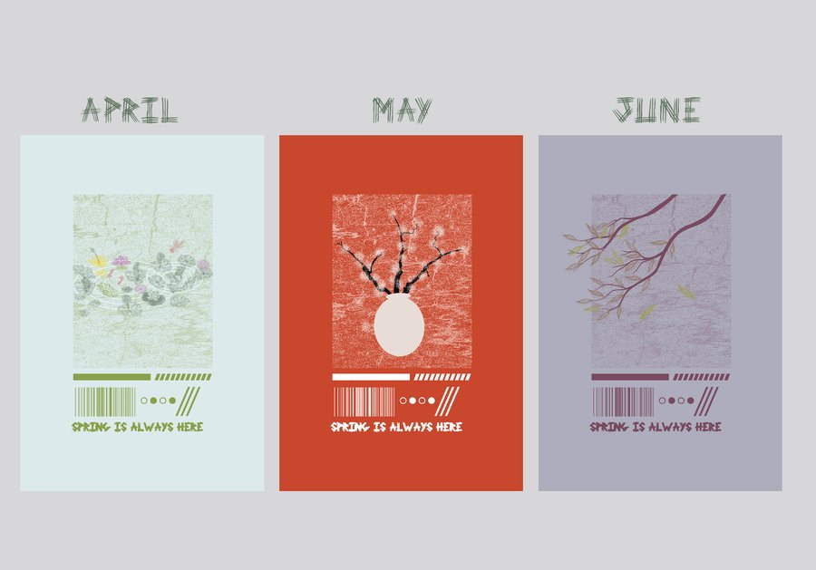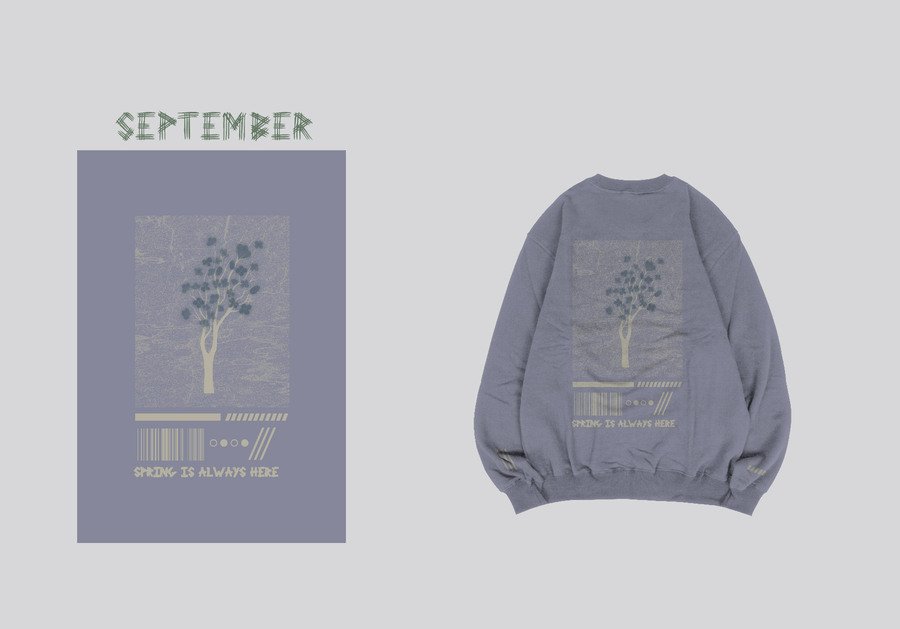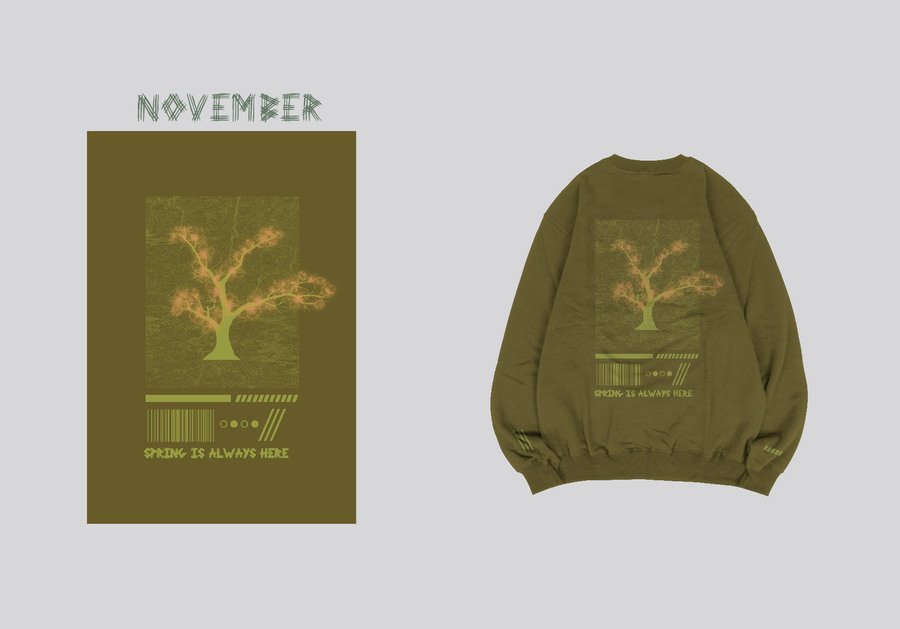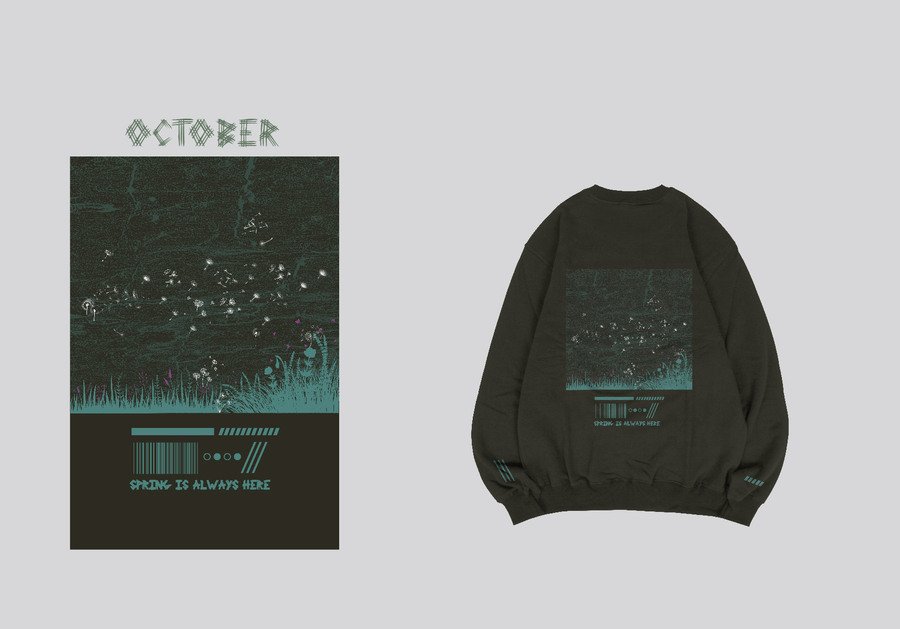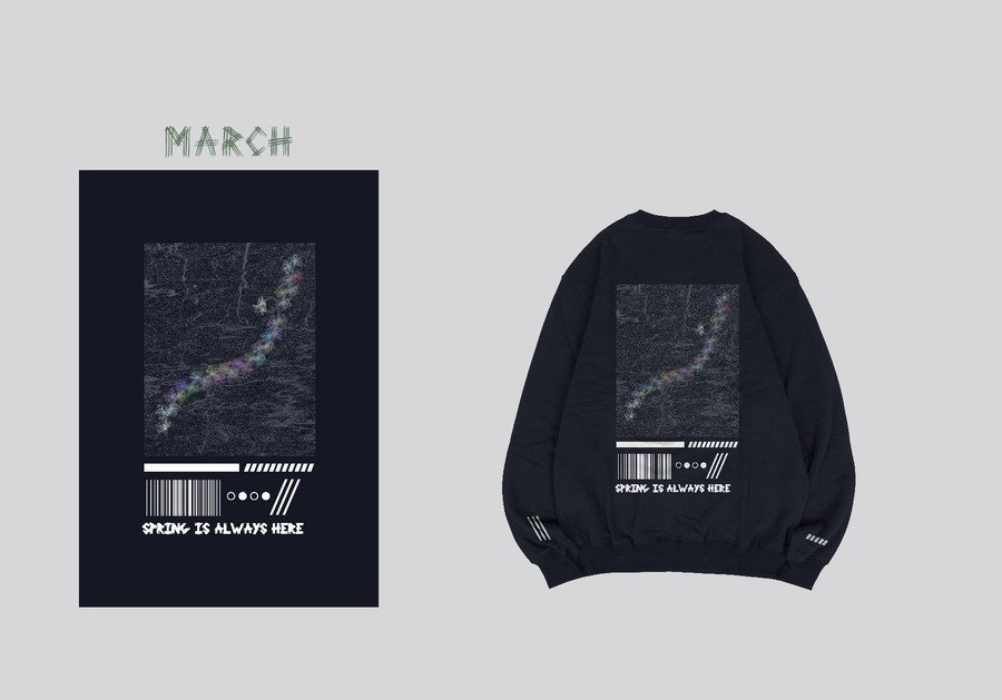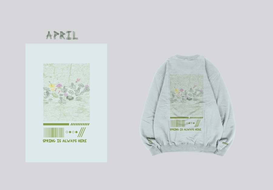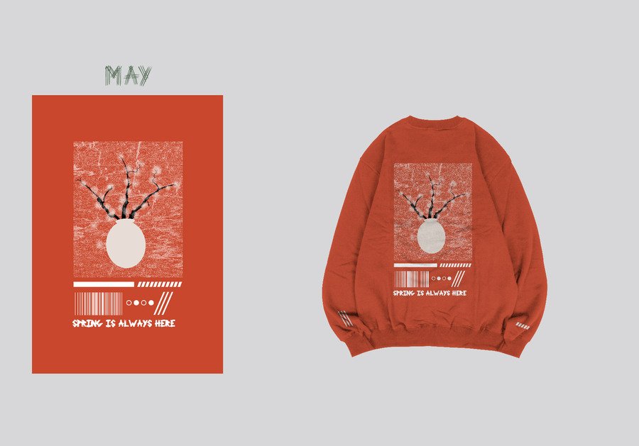 В этом быстром современном обществе связь между человеком и природой постепенно ослабевает. Через «Весна всегда здесь» мы надеемся, что каждый, кто наденет эту одежду, сможет почувствовать ритм жизни и красоту природы. Каждый дизайн одежды вдохновлён элементами календаря и предлагает интерактивный опыт, который побуждает пользователей участвовать. Как наклейки на календаре, которые отмечают время, детали дизайна одежды тихо передают экологическую осознанность, пробуждая больше людей к вниманию к природе.