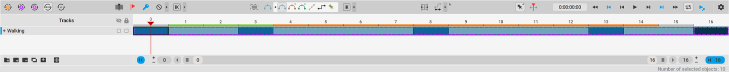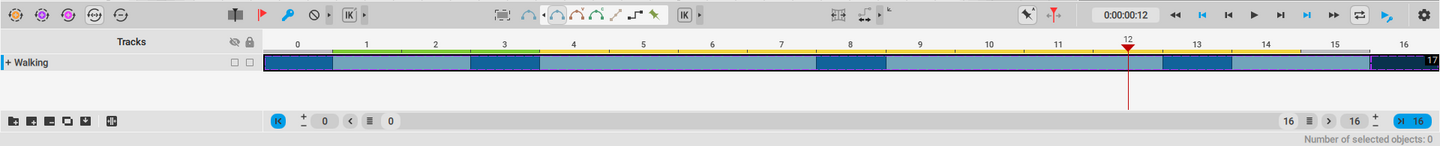 Довольно часто применение ограничений может все-таки пойти не по плану. Обратите внимание на цвета, отображющиеся над треком анимации в таймлайне. Зеленый цвет означает, что обе ноги персонажа соприкасаются с землей