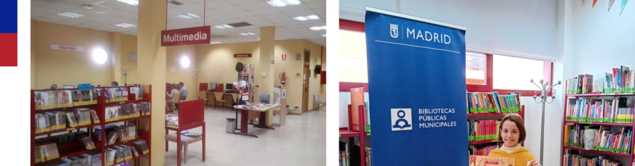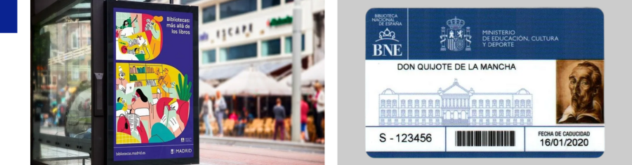 Слева направо, сверху вниз: (1, 2, 3) Плакат и посты в соцсети Национальной библиотеки Испании; (4) Объявление в Библиотеке Ивана де Варгаса; (5, 6) Вывески Муниципальной публичной библиотеки, Мадрид