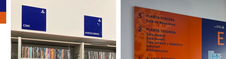 Отдельно стоит проанализировать цвета Мадридских библиотек: также, как в супермаркетах довлеющим цветом является зеленый, в айдентике этих пространств преобладает насыщенный синий цвет.
