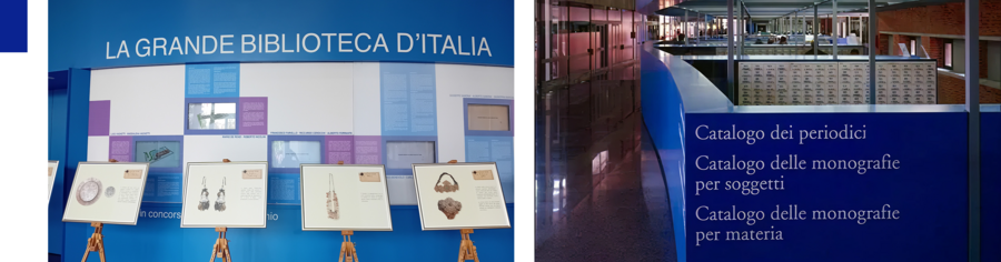 Слева направо, сверху вниз: (1) Стендер в Библиотеке Анджелики, Рим; (2) Стойка информации Национальной центральной библиотеки Рима; (3, 4, 5) Вывеска, навигация и объявление в Библиотеке Рима