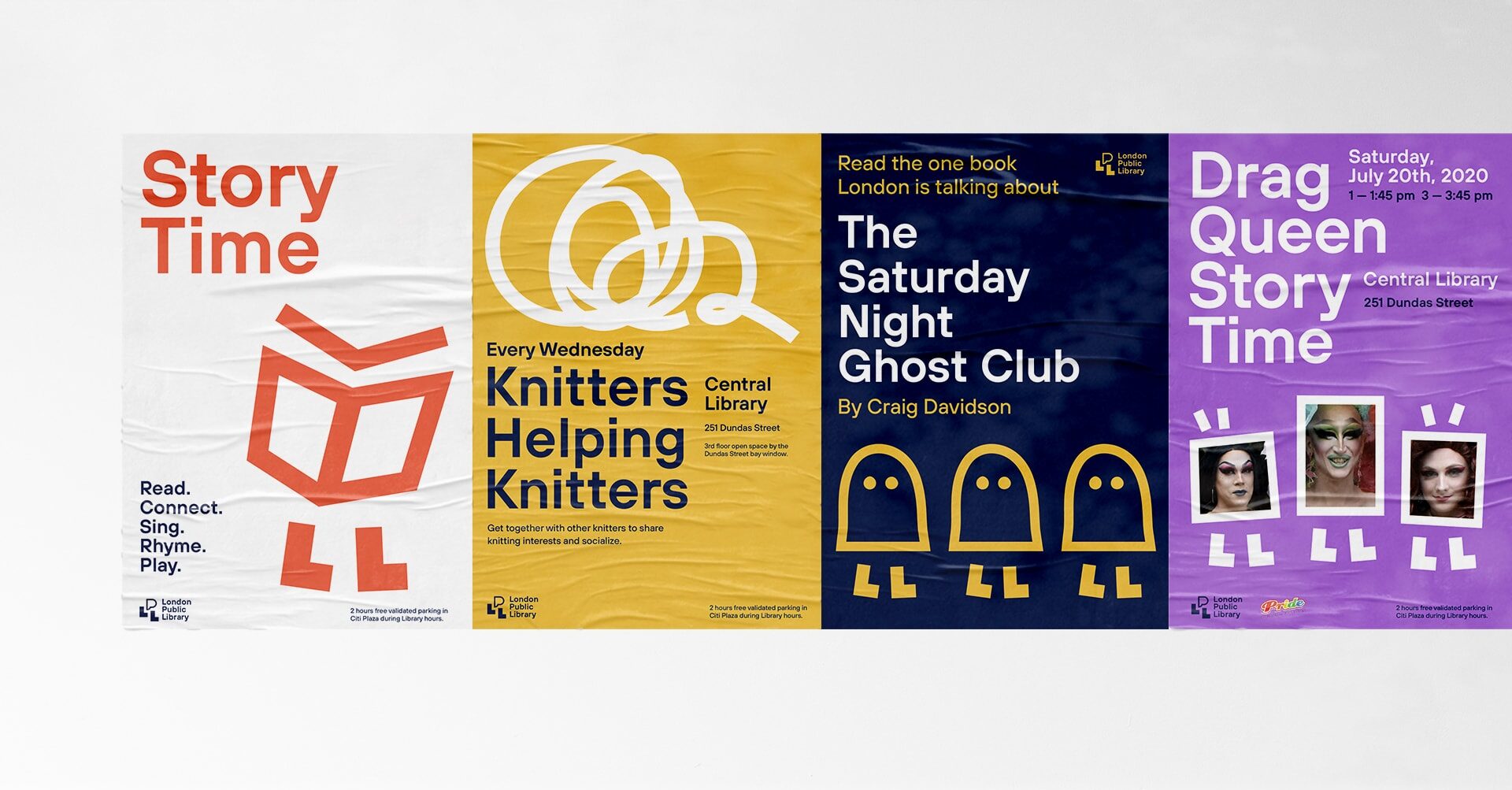 Слева направо, сверху вниз: (1) Пост в соцсети Британской библиотеки; (2, 4) Пост в соцсети и навигация Библиотеки Лондона; (3) Шоппер Лондонской публичной библиотеки (Bruce Mau Design, 2021)