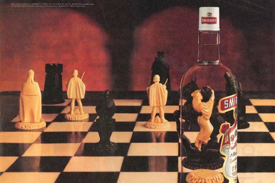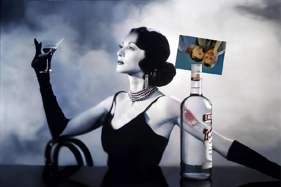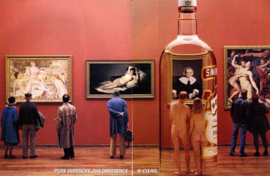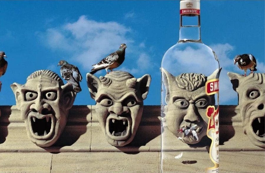 Реклама водки, которая демонстрирует, как все может раскрыться под воздействием алкоголя. Противоречие в данном случае заключается в абсурдности выбранных героев, например, младенец, который рекламирует водку.