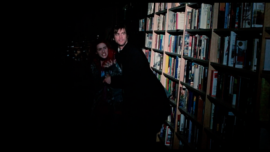 На этом кадре видно, что центральная зона (лицо Джоэла) ещё держит цвет и детали, это остаток памяти, который он пытается спасти, в то время как периферия погружается во тьму — периферийное зрение стирается первым, как в реальном процессе забывания. Затемнение краёв работает как фильтр нейронного распада: зритель физически ощущает, как воспоминание сжимается до точки, а потом исчезает.
