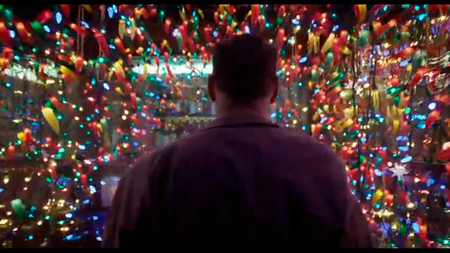 Свет в этой сцене — это праздник, который убивает. Магазин залит неоновым свечением: красным, зелёным, синим, словно на Рождество. Но это иллюзия радости, которую Гарри приобретает вместе с бутылкой алкоголя. Возникает жёсткий контраст: яркие огни кричат о веселье, в то время как сам герой изображен пьяным и опустошённым.