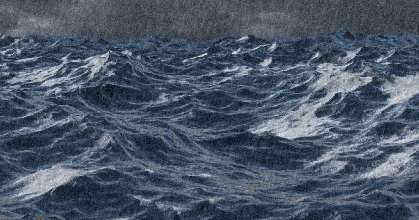 Видеоинсталляция представляет море, которое постоянно меняется между состояниями спокойствия и шторма.