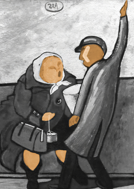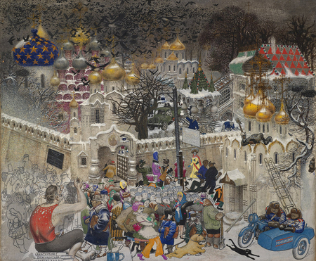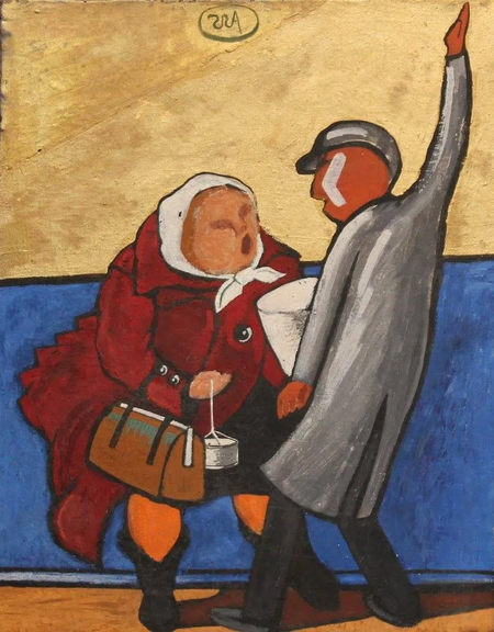 Василий Ситников также изображал столичную жизнь в ее обыденной, но яркой нелепости, в которой оттаскиваемые друзьями пьяницы, мелкие уличные споры, и, казалось бы, незначительные сцены складываются в мозаику подлинного быта. Герои Ситникова — простые обитатели задворок, праздно шатаясь или сидя за бутылкой, переносят нас в реальность городских закоулков, где запах перегара смешивается с грубым смехом «маленьких людей», живущих вне героического повествования.