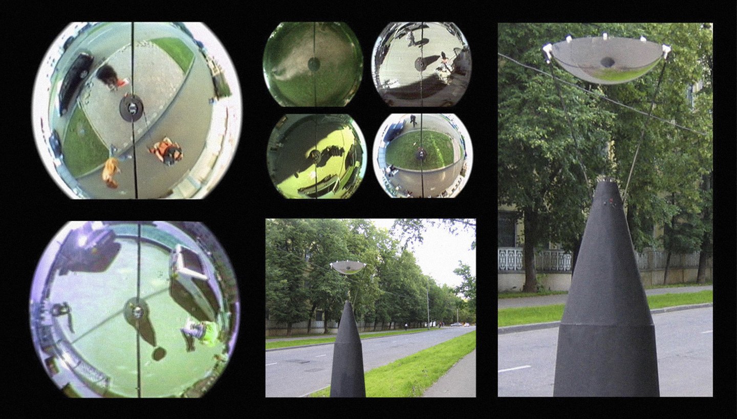 В перформансе «(.) или Пейзаж, наблюдающий сам себя» (2006) арт-группы «Куда бегут собаки» наглядно демонстрируется механизм изменения нашего восприятия. Проект представляет собой установку, состоящую из чёрного конуса, внутри которого находится оператор с видеокамерой, направленной на параболическое зеркало. Оператор перемещает конус, снимая окружающее пространство, ограниченное зеркалом. На экране зрители видят сферическое отражение пространства и искаженное изображение конуса и камеры, при этом сам конус и оператор скрыты за объективом.