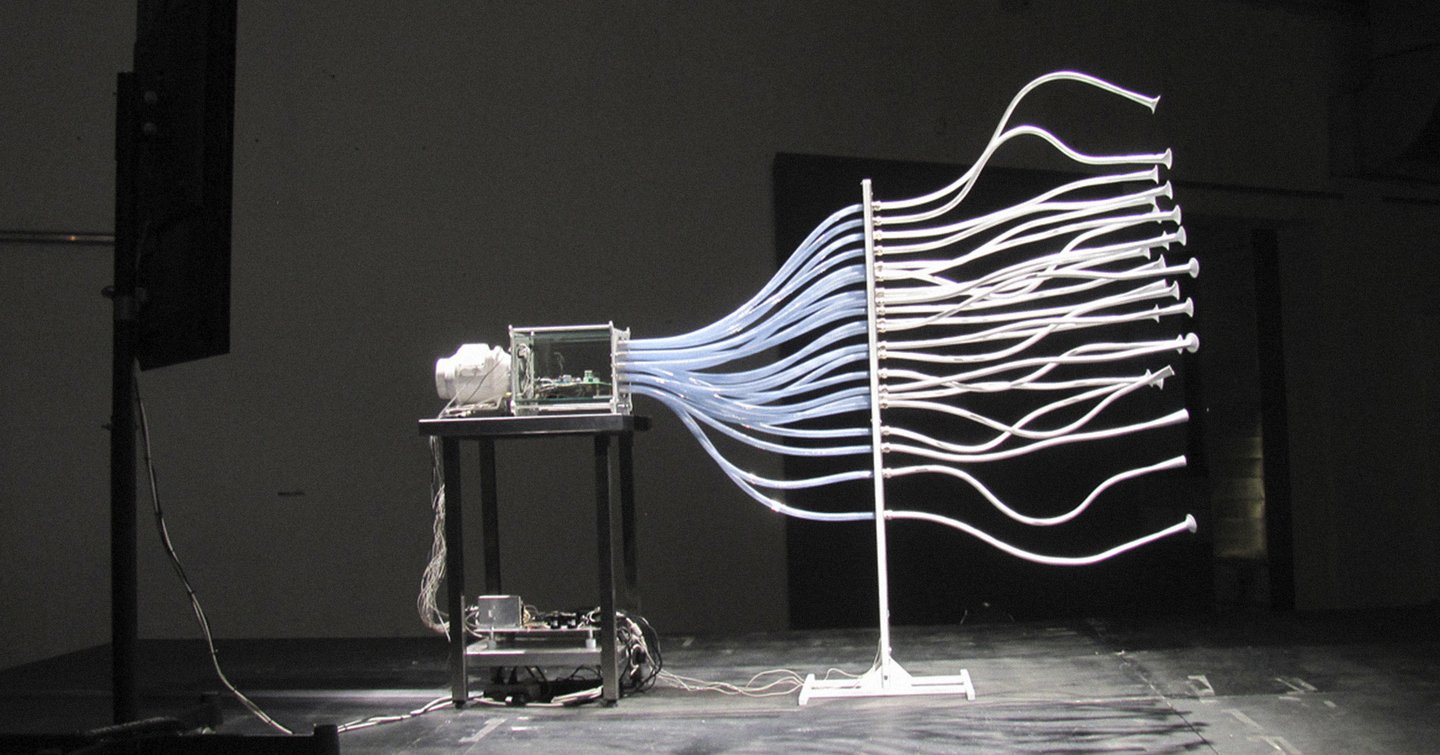 Проект Рафаэля Лозано-Хеммера «Голосовой массив» (2011) расширяет границы восприятия через преобразование звука в свет и создание динамической звуковой и световой инсталляции. Каждый голос, записанный в микрофон, превращается в уникальную световую петлю, которая взаимодействует с другими записями, постепенно формируя сложную звуковую и световую композицию. Вытеснение старых записей и возможность услышать их отдельно создает интересный эффект «звукового наслоения», где прошлое и настоящее звучат одновременно, накладываясь друг на друга. Это не просто преобразование информации, но новый способ восприятия и общения, где звук и свет взаимодополняют друг друга, расширяя наши сенсорные возможности и представления о звуке и его восприятии.