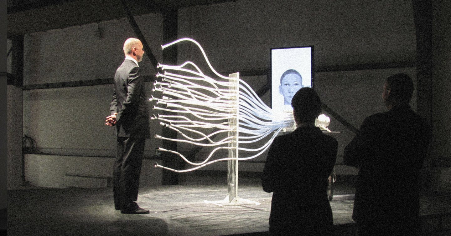 Инсталляция «Лица запаха» (2012) арт-группы «Куда бегут собаки» представляет собой эксперимент на грани искусства и науки, исследующий связь между запахом, восприятием и памятью. Газоанализаторы, печатные платы и трубки, «обнюхивающие» человека, создают уникальный алгоритм для составления «портрета по запаху», где каждая нота влияет на черты лица на экране. Даже отсутствие человека не препятствует появлению «портрета невидимки», подчёркивая постоянное присутствие запахов в пространстве. Главная идея работы —невозможность полного воспроизведения запаха в памяти без повторного восприятия, что делает инсталляцию не только интересным художественным объектом, но и глубоким размышлением о природе памяти и восприятия.