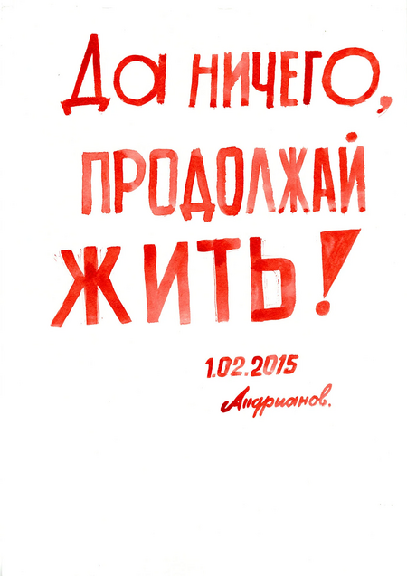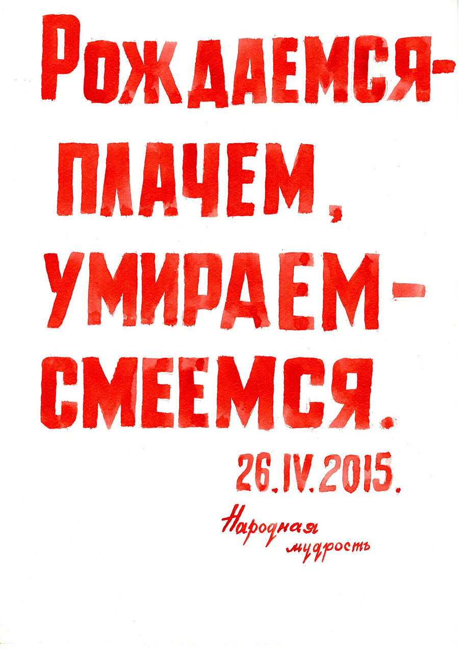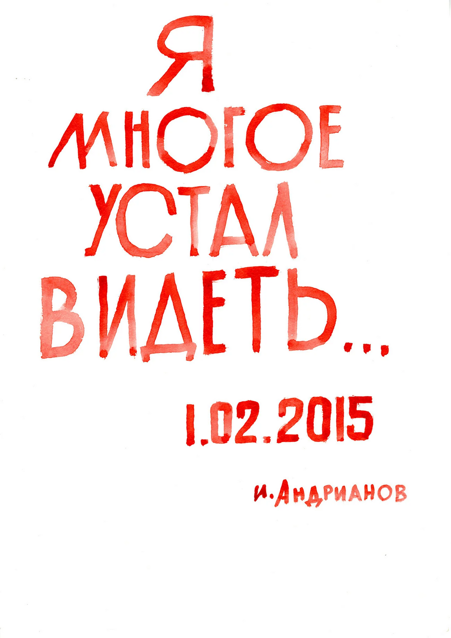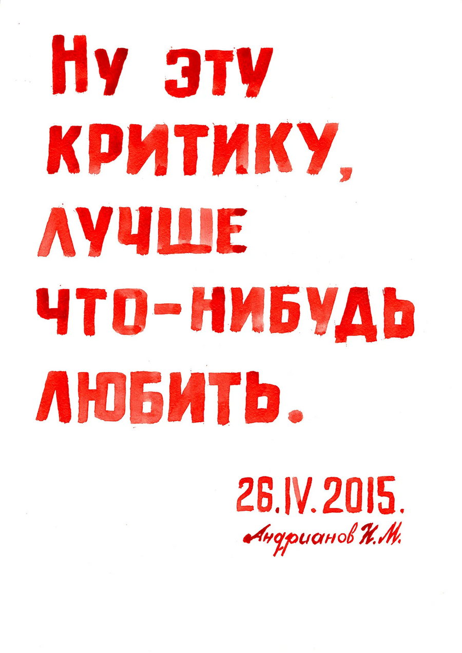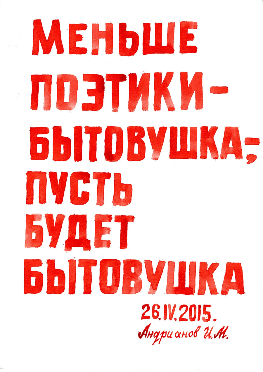 Другой проект, в который входит три серии работ, начался с реакции одного из жителей дома Игоря Андрианова на принесенный каталог с работами Эрика Булатова. Изучив каталог, мужчина вынес вердикт, что сочетание текста и картинки напоминают ему постеры о Советском союзе, но содержание текстов он бы изменил.