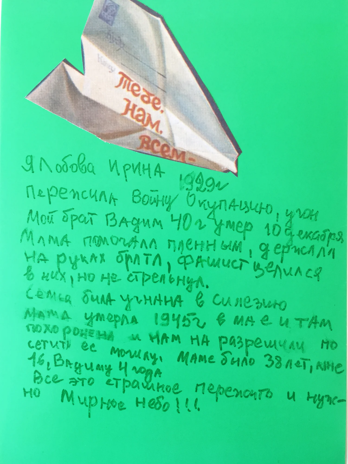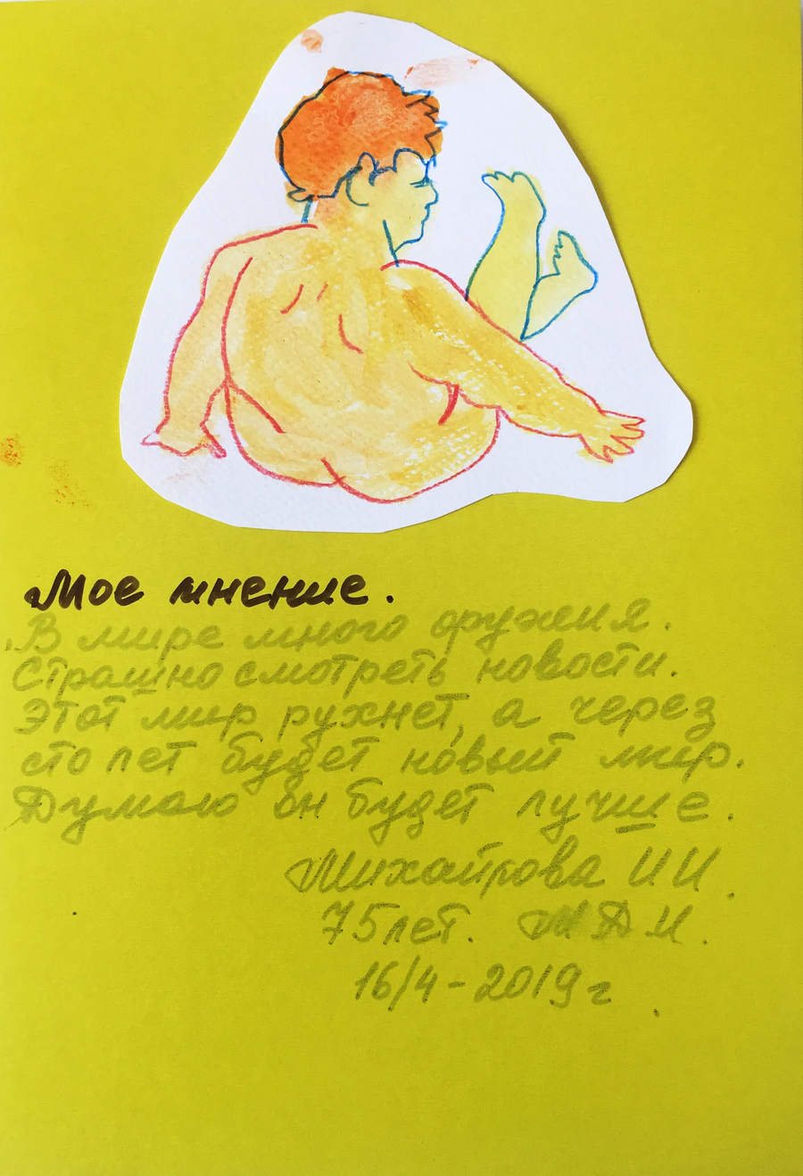 Финальной частью проекта стали «ответы» Павлу Пепперштейну, в которых пожилые люди рассуждали о том, что ждет их и страну через 100 лет.