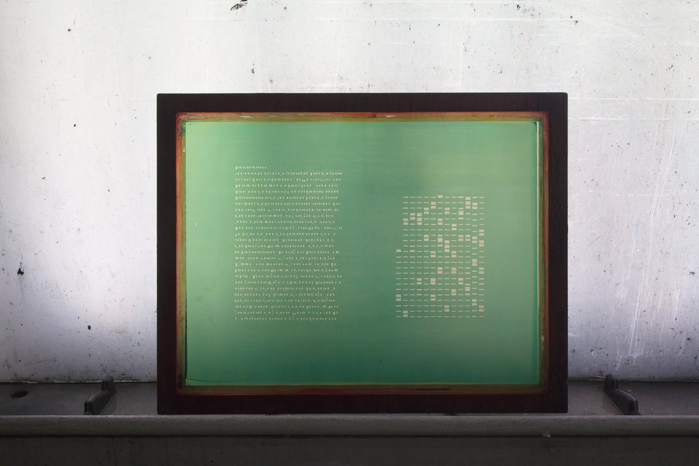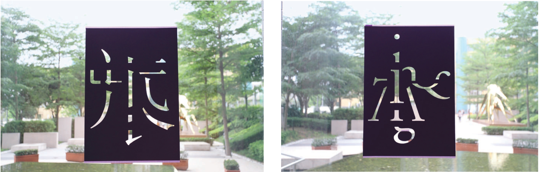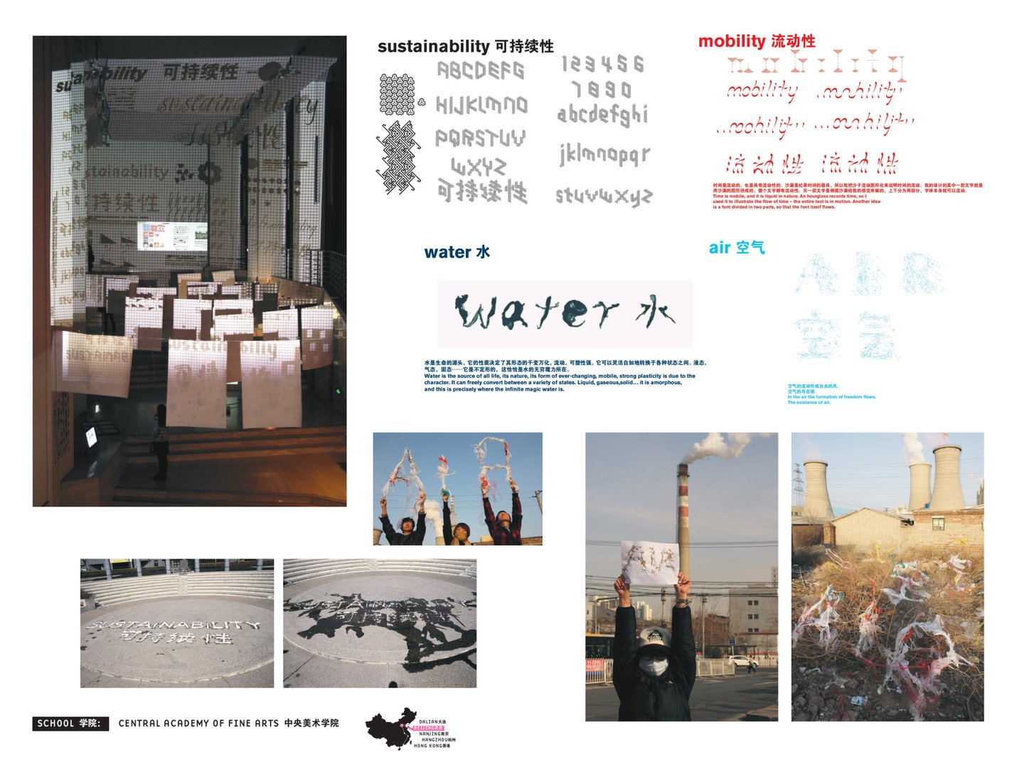 Такое наложение латиницы и иероглифов может также дополнятся полупрозрачностью слов, разным цветом. В работе «Диалог между Китаем и Западом» строки латинского текста накладываются на китайский, тем самым образовывая точку соприкосновения не только знаков разных языковых систем, но и самих культур Запада и Китая. Так создается уникальный синтез, пространство из диалога и взаимовлияния.