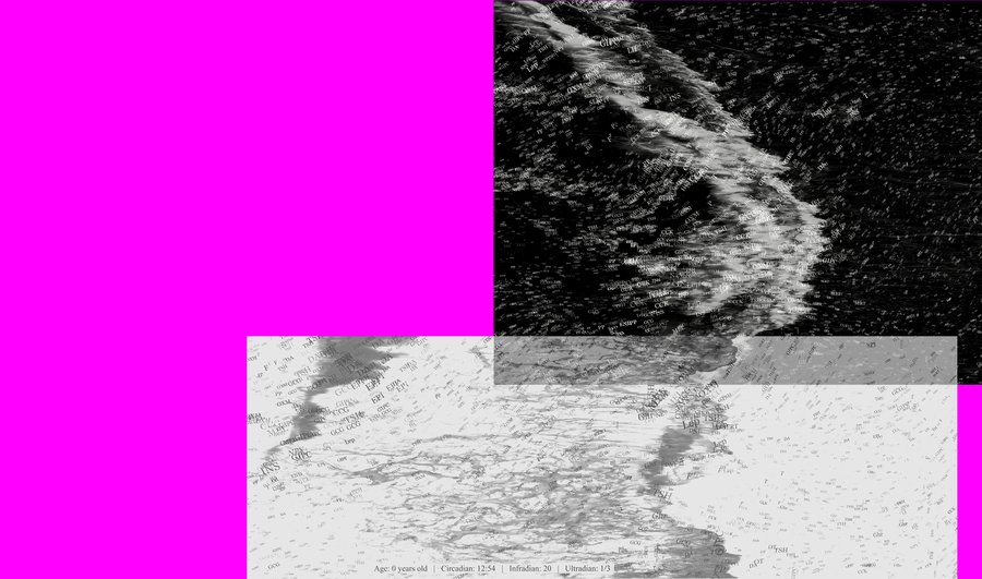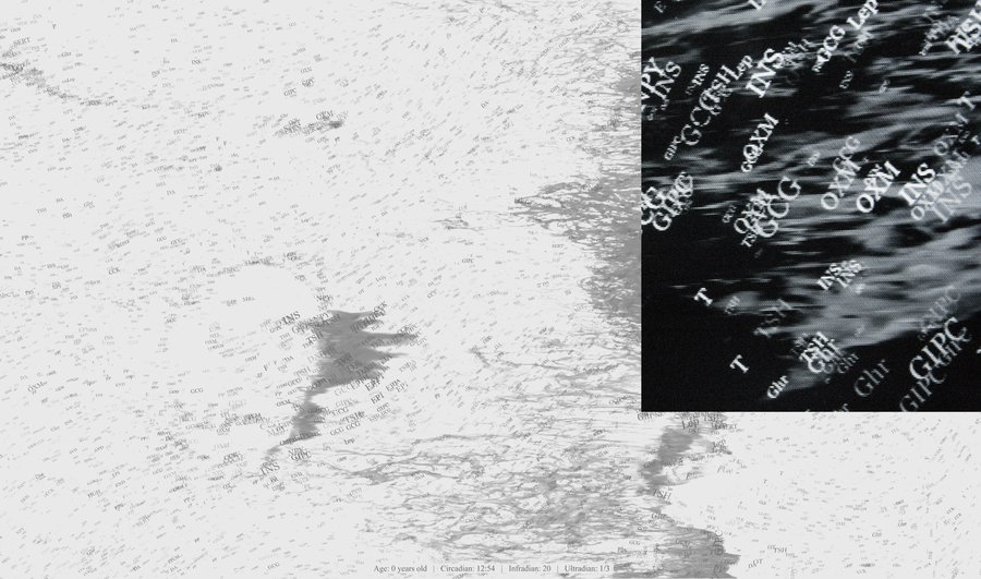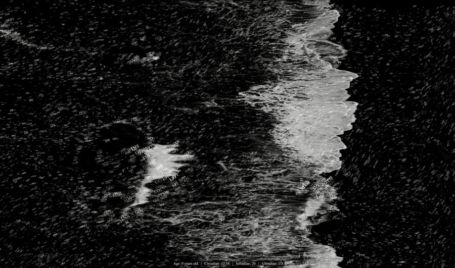 Это интерактивная биометрическая инсталляция, использующая данные об уровне гормонов участников для создания динамического аудиовизуального опыта. Инсталляция, компьютерное «существо» заключает в себе жизнь человека, его хронобиологию, короткий временной промежуток от рождения до смерти. Биологические технологии запечатлевают человека в каждой момент его жизни, иллюстрируют с помощью понятной, осязаемой формы физиологические особенности. Визуальные образы инсталляции — это генеративные «sequences of ocean waves crashing and releasing airborne text particles. The text represents acronyms of hormones that are released in accordance with human time-cycles».