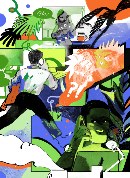 Ход рассуждения Цветовая палитра состоит из приглушённых оттенков розового, фиолетового и желтого, что составляет сплит-комплементарную палитру. Жухлые оттенки вызывают ощущение болезненности и дискомфорта происходящего, что может быть связано с мироощущением человека с СДВГ, пытающегося справляться с бытовыми проблемами. При этом, акцентный жёлтый цвет светится на фоне тусклых оттенков и используется для привлечения внимания к деталям среди шумных штрихов.