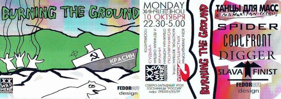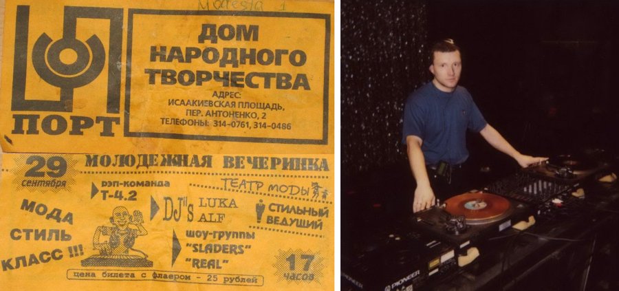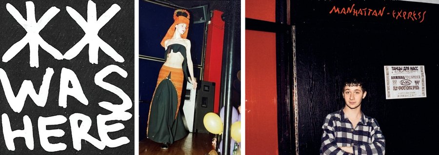 Фирменный тег промоутера Жени Жмакина / Фотография с показа в клубе «Manhattan Express» / Промоутер Женя Жмакин у входа в клуб Manhattan Express, 1994 год / Флаеры клуба, 1994 год