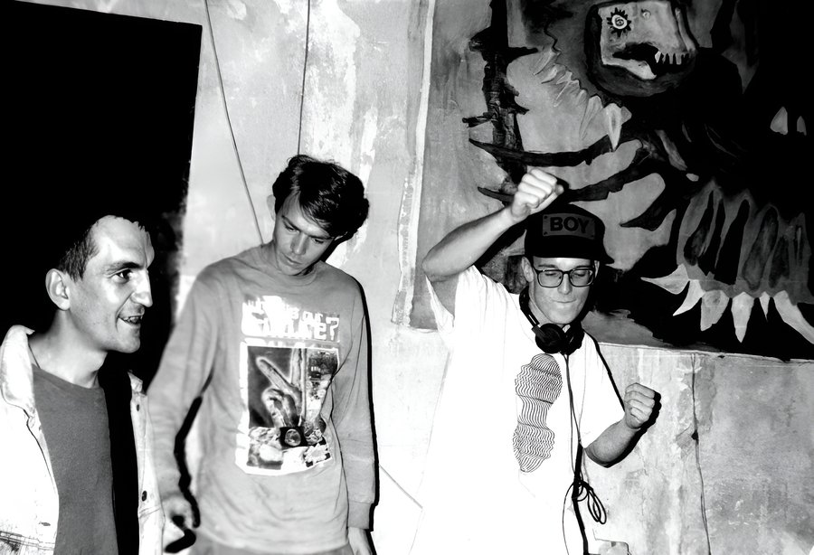 На фотографии Тимур Новиков, Сергей Бугаев-Африка, Габриэль Воробьев в клубе «Танцпол» / Фотография из скота на Обводном канале, фото: Игорь Шакунов (быстрый), начало 1990-х годов