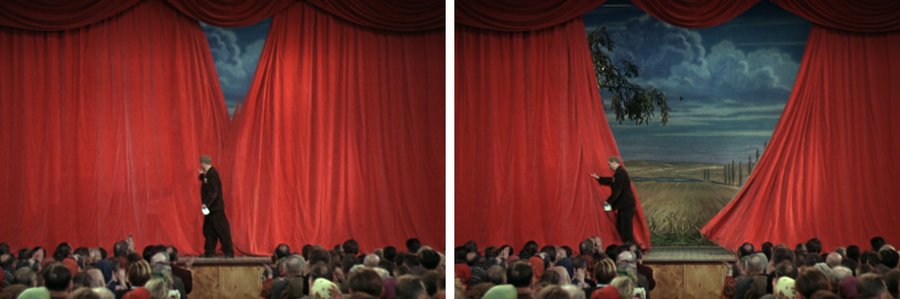 Деревня теперь это буквально декорации этой деревни, раскрашенный холст или картонные конструкции. Показывать было попросту нечего, поэтому возникла потребность в искусственно созданном заднике, который полностью заменил собой то, что он изображает. То есть, деревня это и есть её изображение. Подмена осуществилась окончательно.