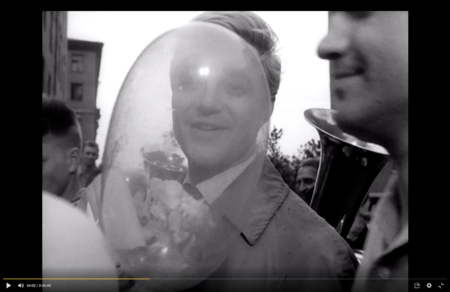 В следующей сцене Сергей идёт среди огромной праздничной толпы. Повсюду флаги, плакаты, лозунги. Город погружён в организованное веселье. В массе людей Сергей замечает ту самую девушку из автобуса — Аню. Он успевает сказать несколько слов, но она почти сразу уходит, теряясь в потоке.