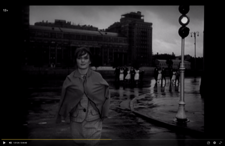 Герой идёт прямо и размеренно, не ускоряясь и не меняя траекторию. Камера в основном статична или плавно следит за ним. Создается ощущение «наблюдения издалека». Когда в конце прогулки напротив появляется Аня и появляется встречное движение ритм становится более живым, добавляется динамика и меняется ощущение. Монтаж спокойно и медленно «дышит», зритель успевает разглядеть и прочувствовать пустоту. Снова длинные планы и редкие смены ракурсов.