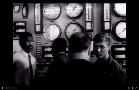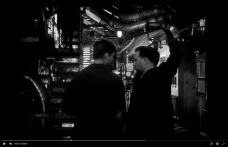 Мы перемещаемся на завод, где кадр заполнен приборами. Герои оказываются «внутри механизма», камера медленно бездыханно движется в бок, следя за разговором. композиция строится через глубину пространства: герои проходят по узким проходам между металлических конструкций, словно через лабиринт. Герои снова расходятся во мнениях, их диалог не складывается.