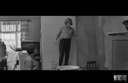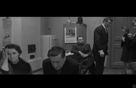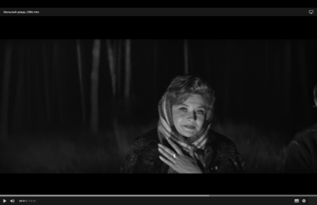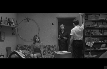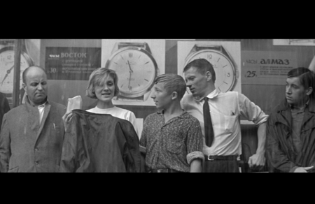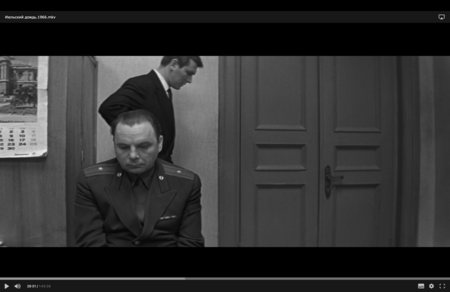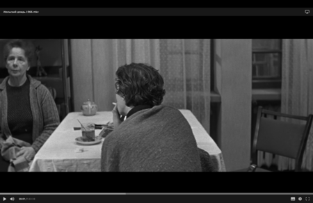 Видна перспектива комнаты, но она не даёт ощущения глубины: задний план и передний выглядят ровными и плоскими. Это создаёт эффект оцепенения, когда время будто застывает. Свет из окна ровный и равномерный. Он не оживляет пространство, а подчёркивает его недвижимость. Хуциев показывает отражение смерти в людях. Во взгляде матери, в ее позе и спине. Только ее эмоции несколько раз вырываются наружу и выражаются ярко. Все остальные будто боятся сделать лишнее движение и застывают. Этот эпизод говорит о внутреннем больше не через эмоцию, а через форму.