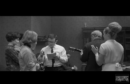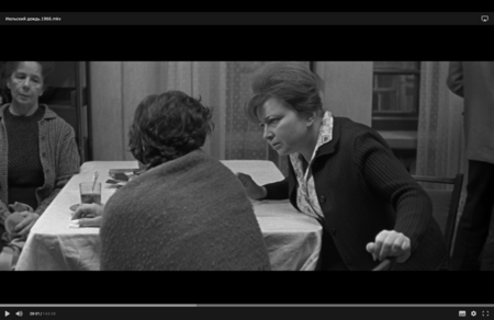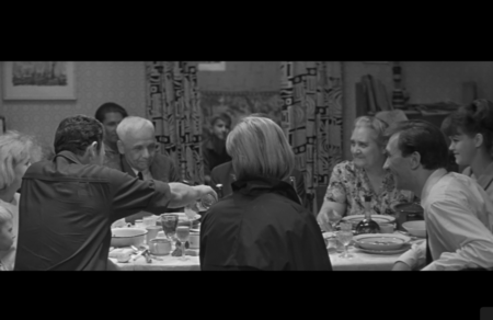 В одной квартире — обед, смех, ощущение привычного благополучия; в другой — напряжённый разговор, накопившиеся недосказанности; где-то — заскучавшие пожилые люди. Монтаж не выстраивает линейного ритма: камера переходит от одного интерьера к другому, следуя не логике действия, а логике наблюдения. Лена смотрит, слушает, говорит, но остаётся в стороне, не принадлежа ни одному из этих миров. Хуциев визуально подчеркивает её позицию наблюдающего человека, оказавшегося между участием и отчуждением. Сцена передает плотность быта, отражая внутреннее состояние Лены.