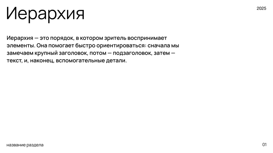 Иерархия — это порядок, в котором зритель воспринимает элементы. Она помогает быстро ориентироваться: сначала мы замечаем крупный заголовок, потом — подзаголовок, затем — текст, и, наконец, вспомогательные детали. Правильная иерархия сделает слайд «читаемым» даже с первого взгляда.