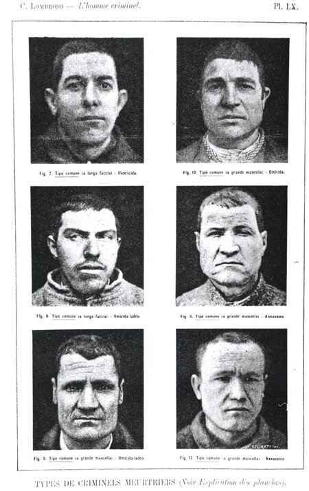 Чезаре Ломброзо (1835–1909 гг.) соединил идеи Лафатера и Галля с дарвиновской теорией эволюции и создал криминальную антропологию[26]. В 1876 году он опубликовал книгу «Преступный человек» (L’Uomo delinquente), где утверждал, что преступники — это эволюционные отбросы, «атавистические типы», застрявшие на более ранней стадии развития[13]. Они напоминают обезьян, первобытных людей или «современных дикарей», и их можно опознать по физическим признакам — «стигматам».